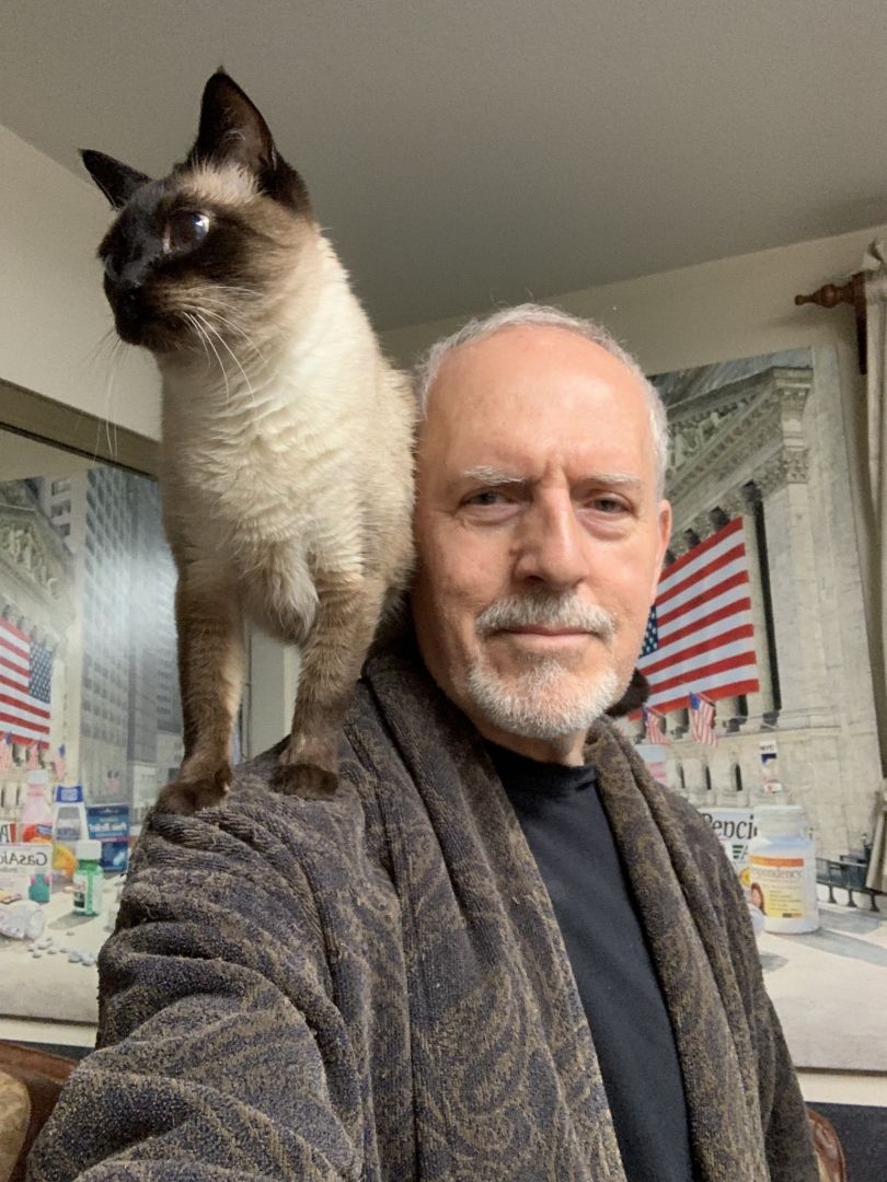 This is a self portrait of me with one of our cats, named Vinnie Van Gogh