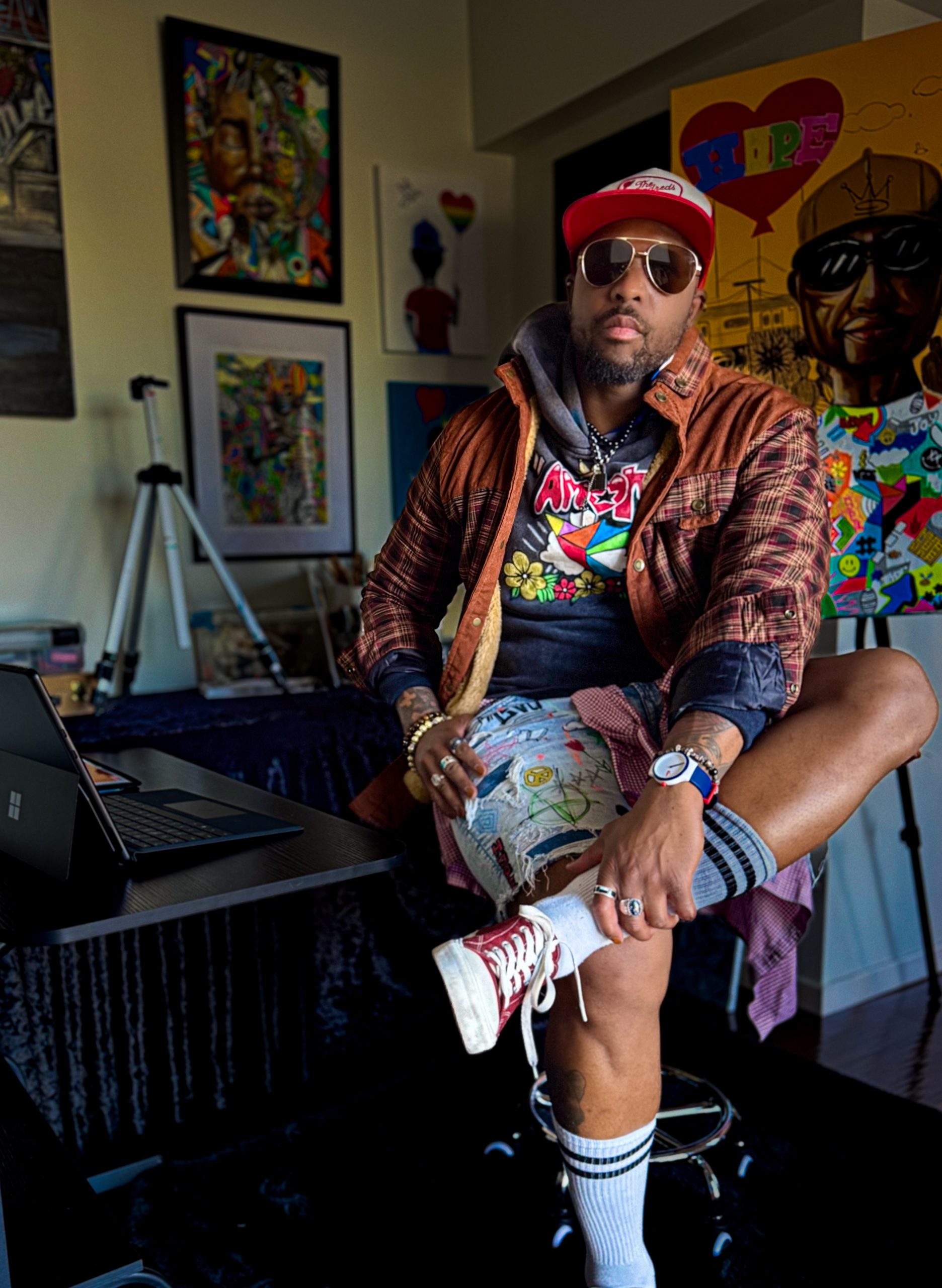 My art is a combination of abstract portrait/figurative work, often with texture, street art, pop art and graffiti elements. Nature landscape and pattern work also play a big part in what I create. Recently getting more involved in fashion, creating my own one-off pieces of clothing, modeling for Avangard brands exploring screen printing and expressing influential ideas about fashion have become more prevalent. Having more opportunities to dive into photography in the last has been a huge part of what I am currently creating. Shooting portrait work, black and white photography, self-portrait, fashion, editorial and event photography are some of the things expressed in my photo work. Growing up loving interior design I also have had the opportunity to assist interior staging projects on large concept homes. I think my well-rounded approach to art not just as a painter as in the past now working in multi- faceted fields of art separates me from a lot of artists but also is relatable to a lot of artists. Most creatives have other creative passions, and I think by showing mine it inspires others to pursue theirs. I think the past year working on projects for Barbie, creating work for my third museum show, and being honored Grand Mashal of Palm Springs for Gay Pride as an artist were all highlights for me. I think the greater success was doing this while getting out of an abusive relationship, dealing with homelessness, losing family and friends while adapting to new social environments that weren’t as accepting to the ones I’ve experienced in the past.