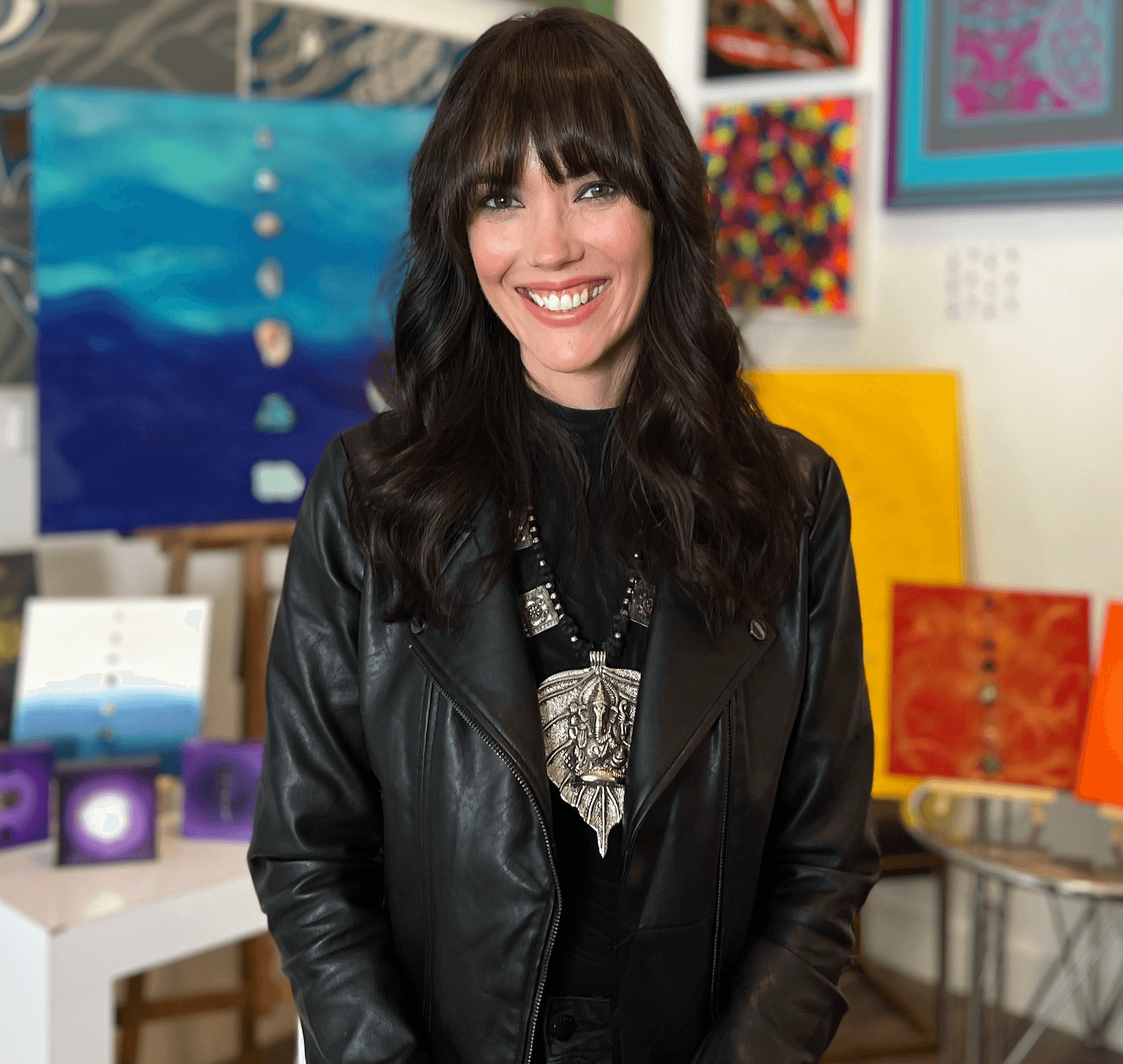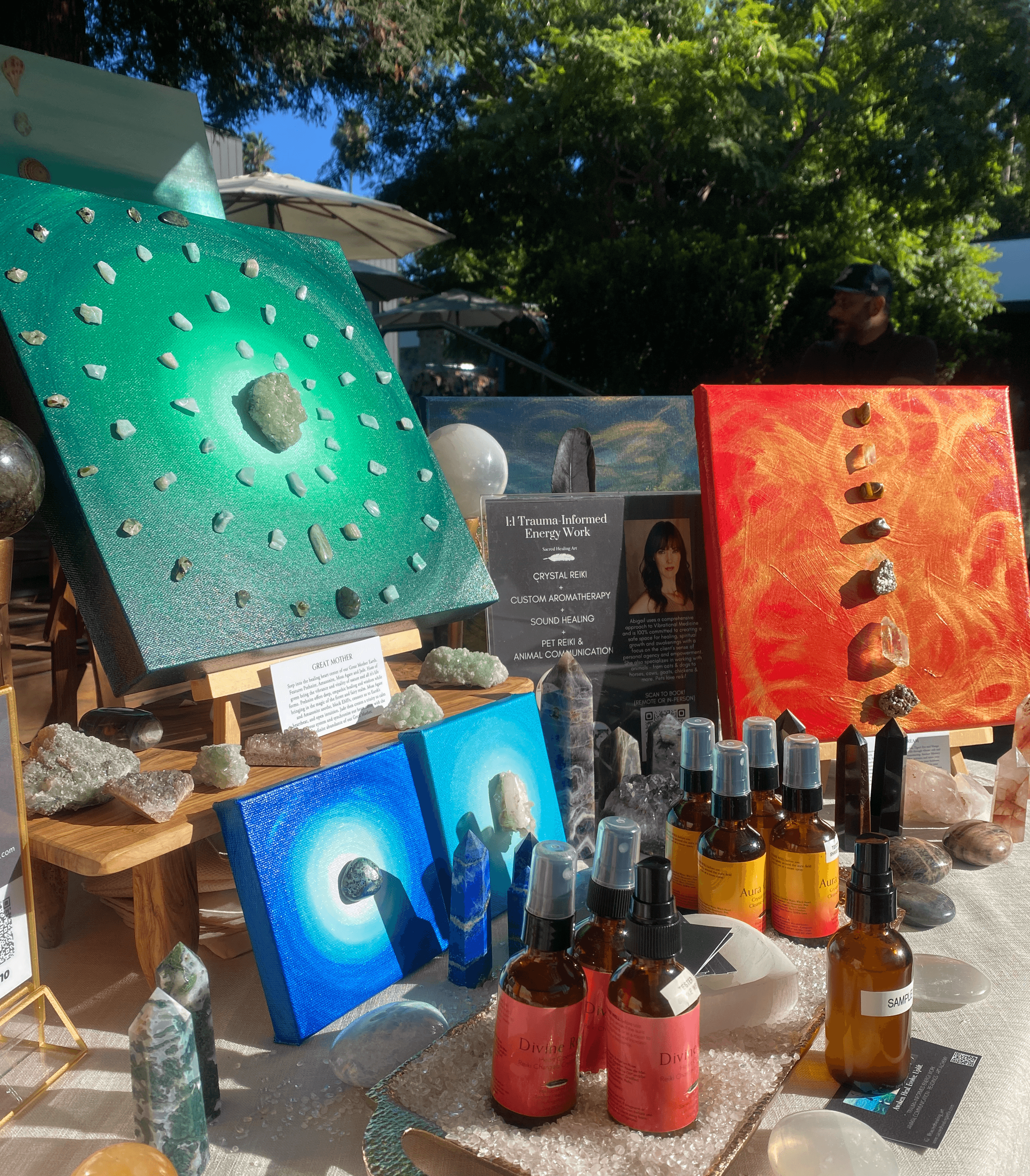 By trade, I’m an actor, but during the pandemic I returned to my first loves: painting and writing. The paintings came first and that was the beginning of my business Sacred Healing Art, which expanded in 2022 to include my healing work with people and animals. Essentially it’s a holistic healing platform that bridges art, spirituality and trauma-informed healing/vibrational medicine through a variety of services, products, and of course, artwork to Awaken, Heal, Evolve, and Uplift humanity. I use a comprehensive approach in my work – color, scent, sound, touch – to create a full sensory experience.