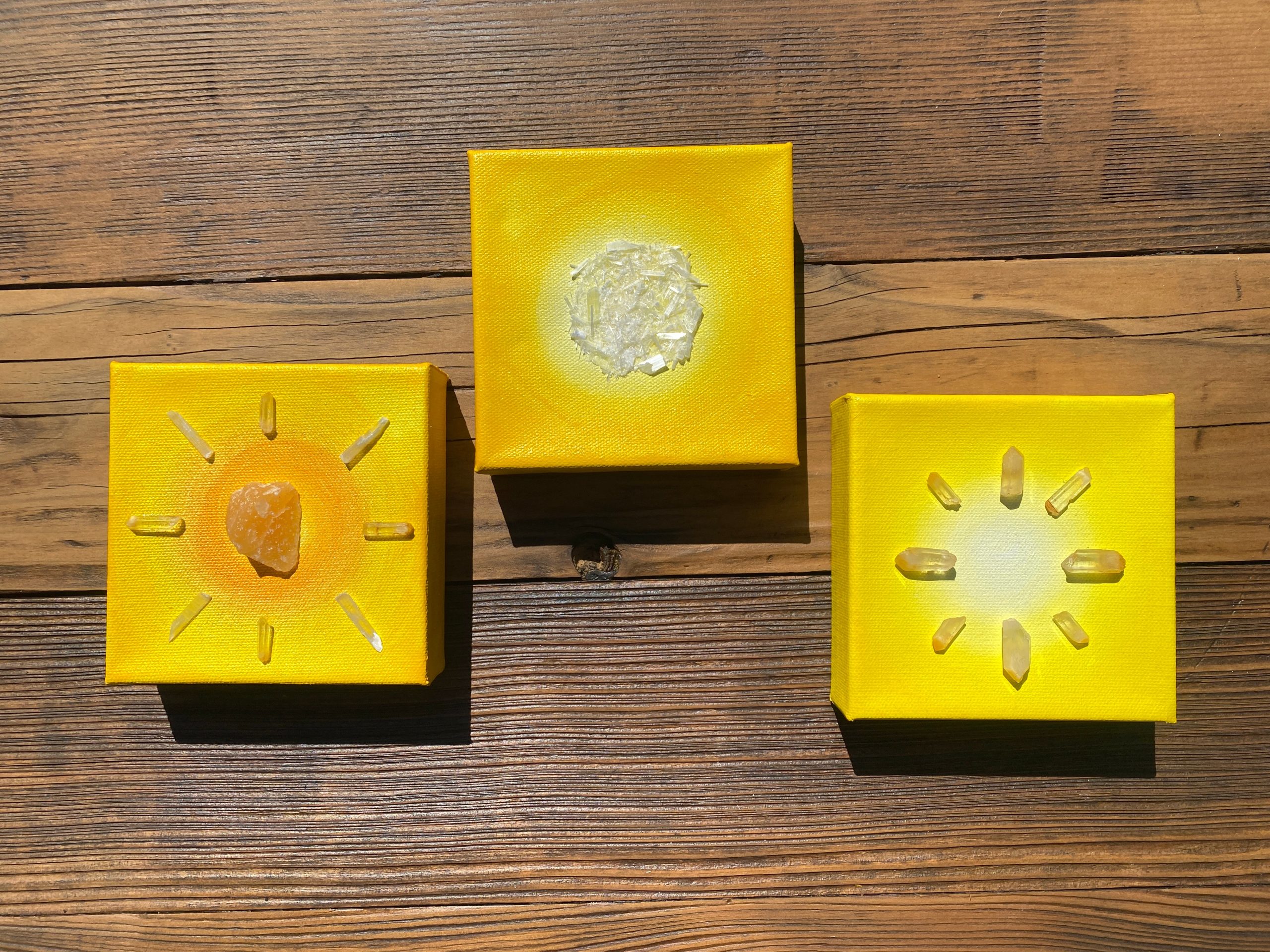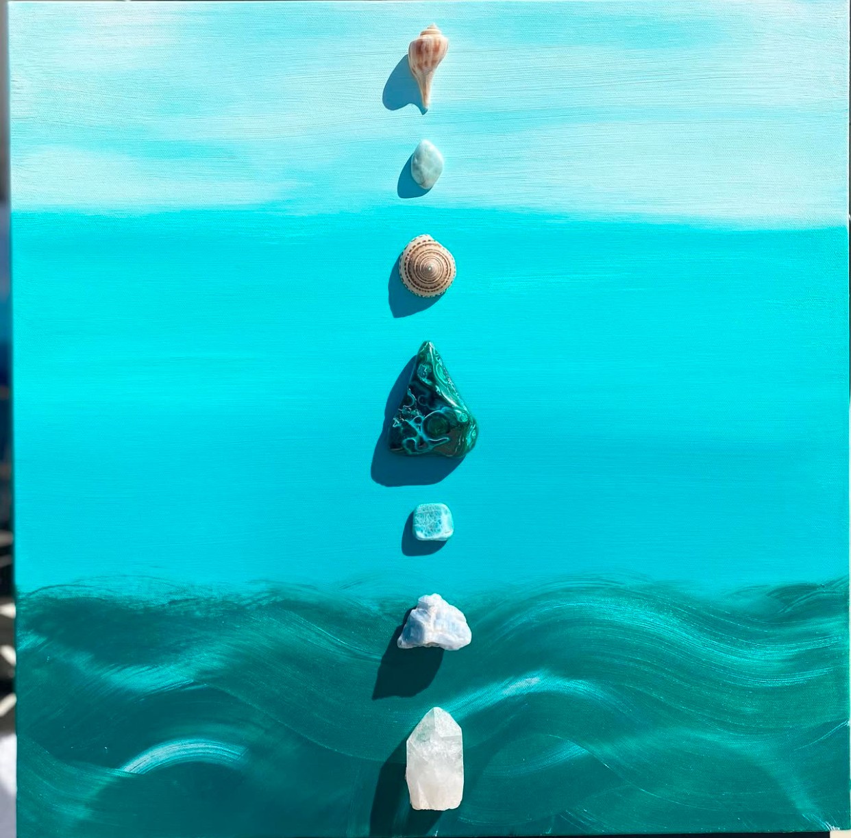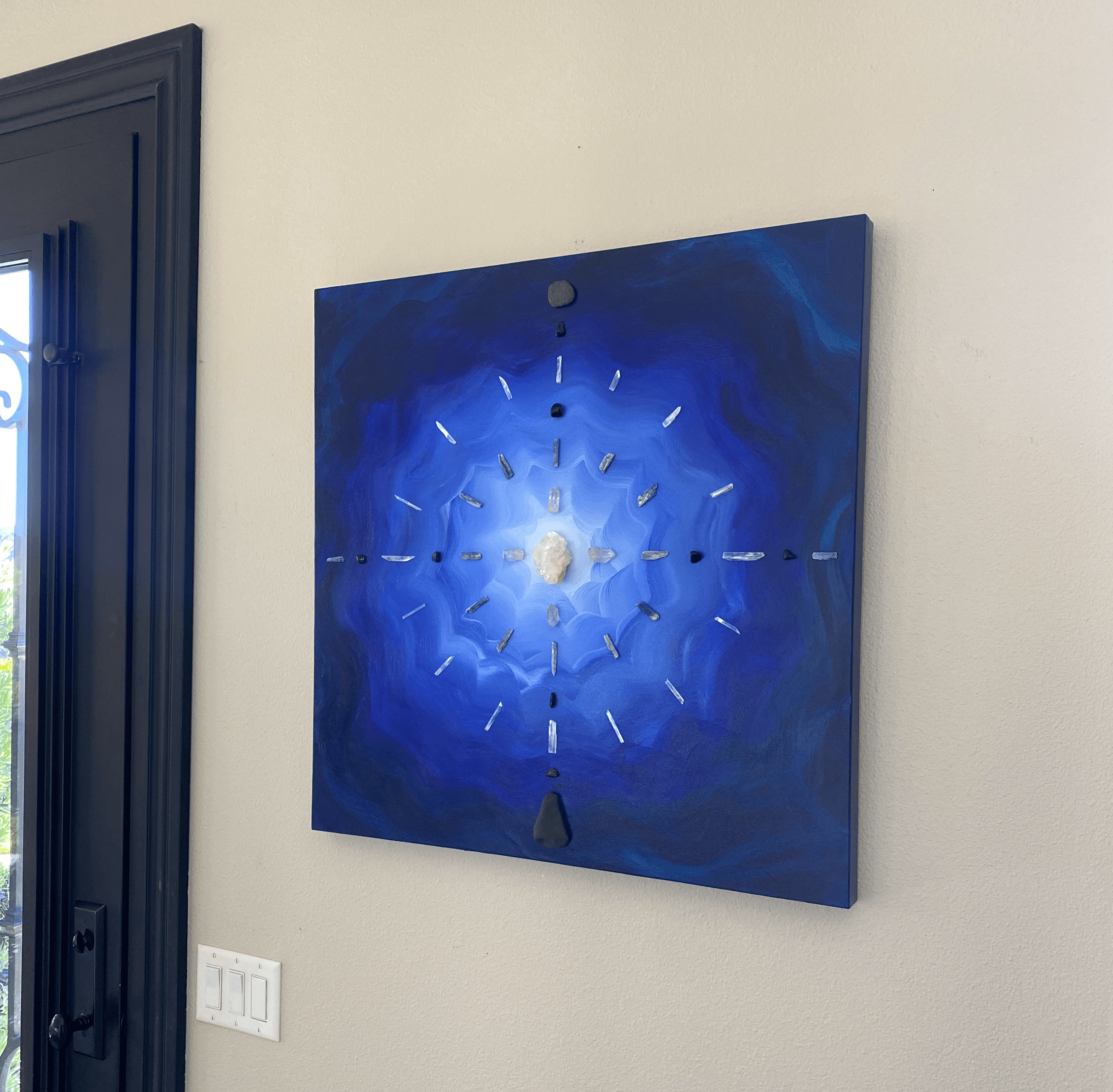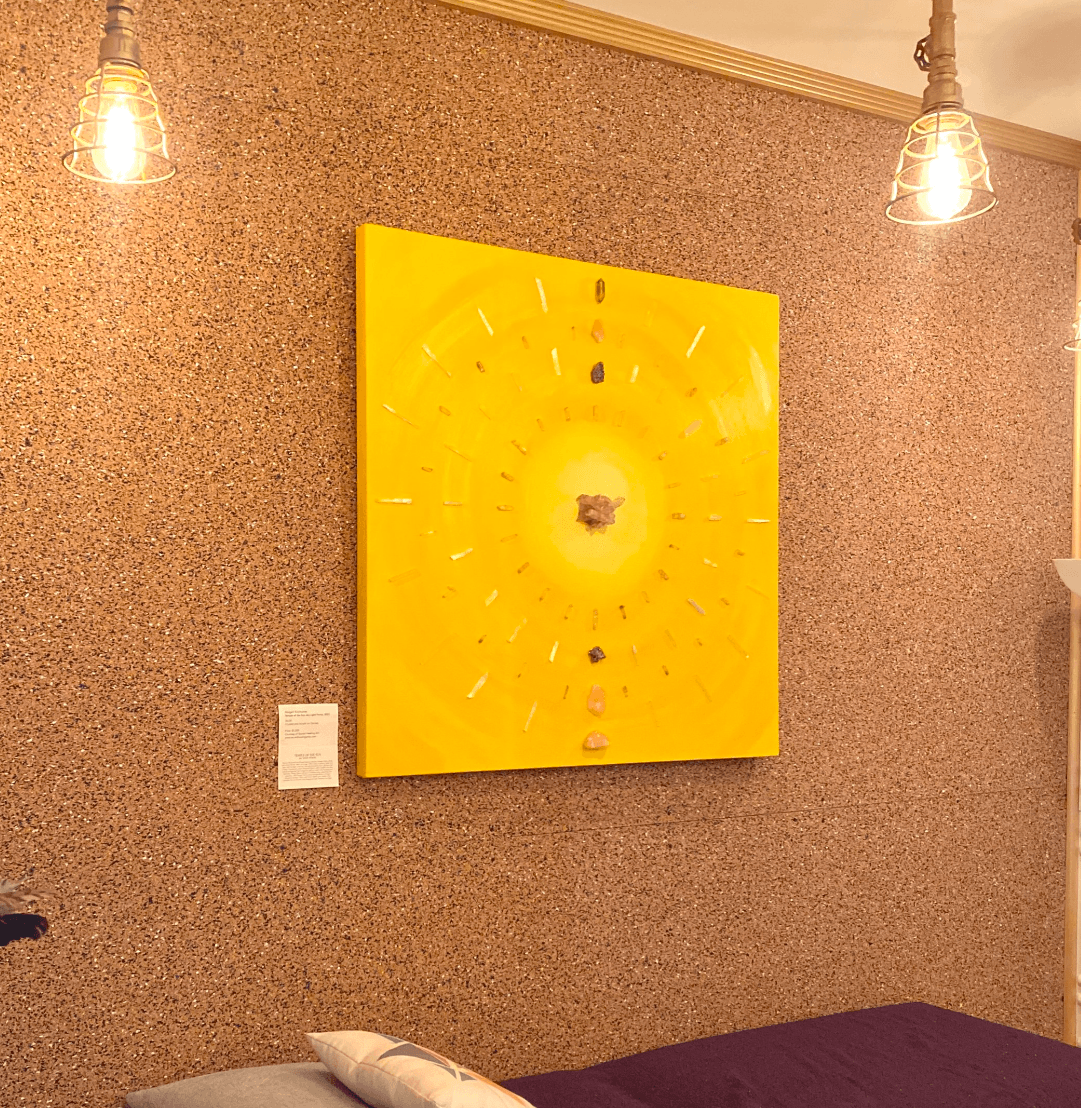 The paintings are three-dimensional mixed media pieces that incorporate color therapy and crystal energy to create a functional healing art piece. “Frequency Shifting Art” I call it. And every piece comes with a poetic story or healing intention that I write. It started with this collection of crystals I inherited from my grandfather. Back in the 70s he was collecting, tumbling and polishing them and making jewelry. After he passed in 2014, I often felt his presence and got messages from him. During lockdown, I got deep into meditation, and it was in one of these meditations that I saw the image of my first painting with his crystals on it. Since I wasn’t able to be there when he passed, creating this art feels like my way of nurturing and honoring our ancestral connection, of being able to say thank you and I love you to him.