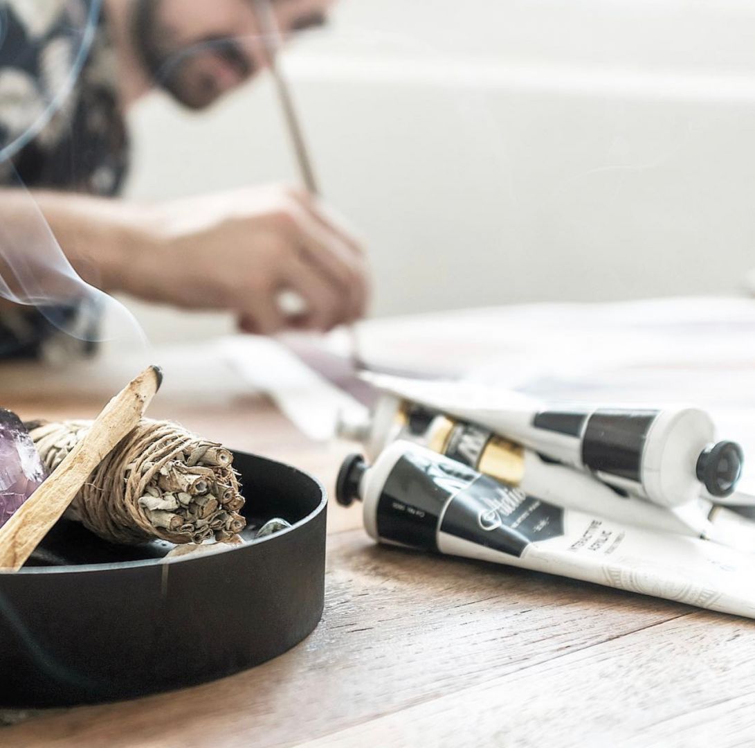 My Mum deserves a shoutout as she is my biggest fan, and has never missed one of my Exhibitions – Her home is also full of framed artworks that I painted when I was younger. My love of music stems from her always having music playing when I was younger, particularly Beth Orton, Sarah Mclachlan, Rufus Wainwright and Natalie Merchant, who I still listen to for inspiration. She also often had essential oils burning – Which I now do every day, much like colours can affect your emotions, essential oils can also affect your mood and energy – I always paint with oils burning, and sometimes add these to the paints. If I am painting a personalized artwork for an anniversary or a special gift, I like to add a few drops of Ylang Ylang Oil to the paints as it symbolizes passion, once framed you can’t smell the oil, but it’s nice to know the painting is infused with an added layer of meaning.