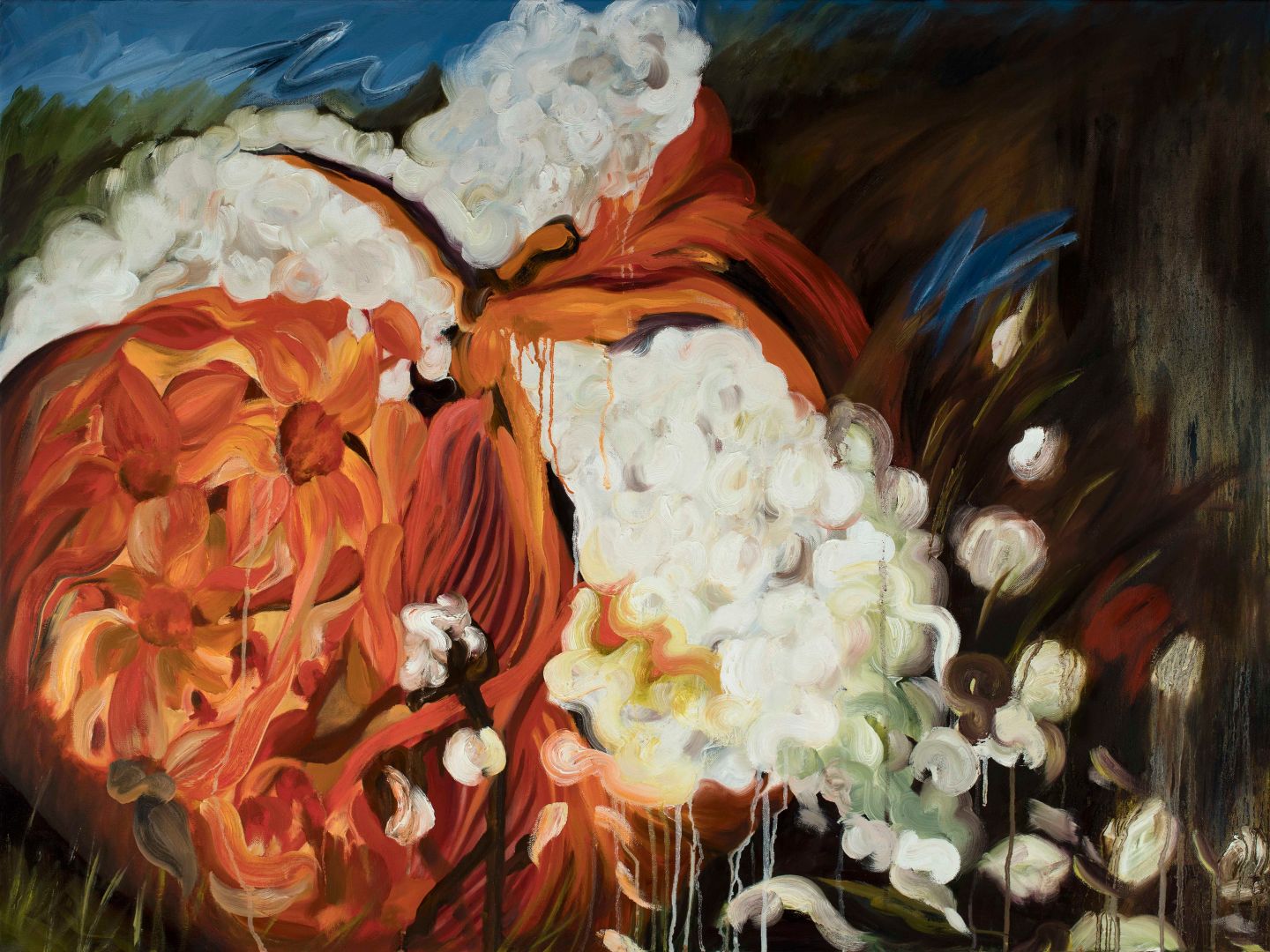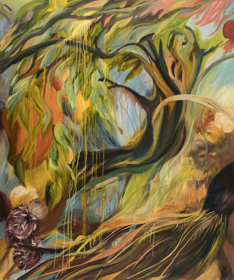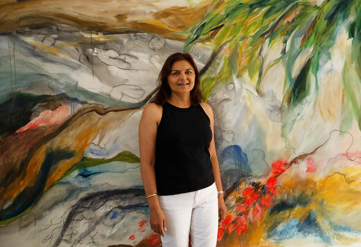 Searching for a connection with my heritage and culture, I stumbled upon hazy memories of endless play at our family farm in Rajasthan, India. While I was born and raised in New Delhi, we spent many vacations at the farm. With no distractions it was the perfect setting for climbing trees, chasing peacocks, eating mangoes and pomegranates, and endless daydreaming. A ragged black-and-white photograph of my grandmother at the spinning wheel immediately transported me back to the farm where we would go cotton picking. I remember my fascination with the exquisitely white, soft, and fluffy cotton flower. It was like no other flower I had seen. We would return from carefree days in the fields with cuts bleeding on our hands and legs from the dry, sharp stems of the cotton plant. Later in life, those early childhood memories evoked a minor obsession with cotton, making it the centerpiece of a series of paintings and further exploration. My art straddles representation and abstraction with largescale paintings in oil on canvas.