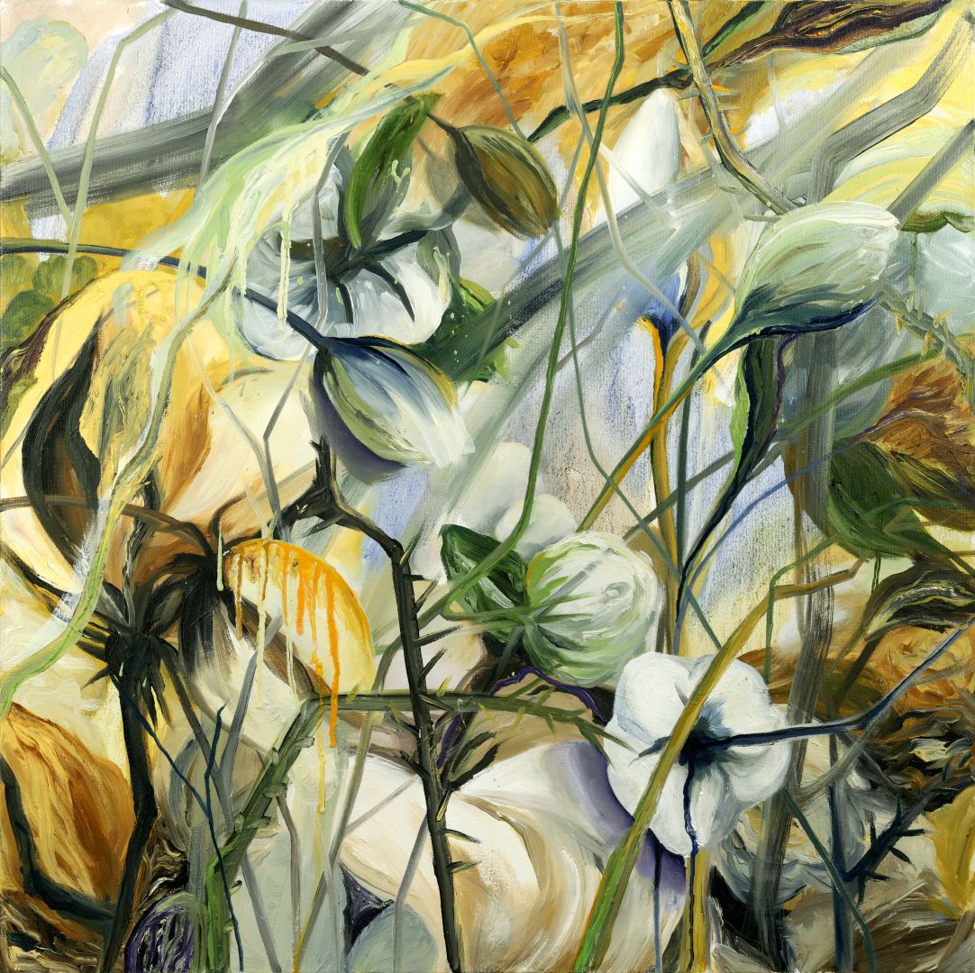 Searching for a connection with my heritage and culture, I stumbled upon hazy memories of endless play at our family farm in Rajasthan, India. While I was born and raised in New Delhi, we spent many vacations at the farm. With no distractions it was the perfect setting for climbing trees, chasing peacocks, eating mangoes and pomegranates, and endless daydreaming. A ragged black-and-white photograph of my grandmother at the spinning wheel immediately transported me back to the farm where we would go cotton picking. I remember my fascination with the exquisitely white, soft, and fluffy cotton flower. It was like no other flower I had seen. We would return from carefree days in the fields with cuts bleeding on our hands and legs from the dry, sharp stems of the cotton plant. Later in life, those early childhood memories evoked a minor obsession with cotton, making it the centerpiece of a series of paintings and further exploration. My art straddles representation and abstraction with largescale paintings in oil on canvas.