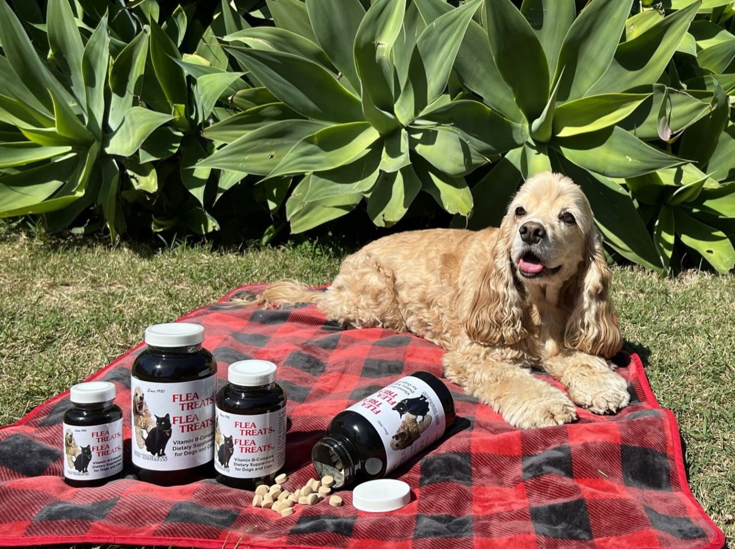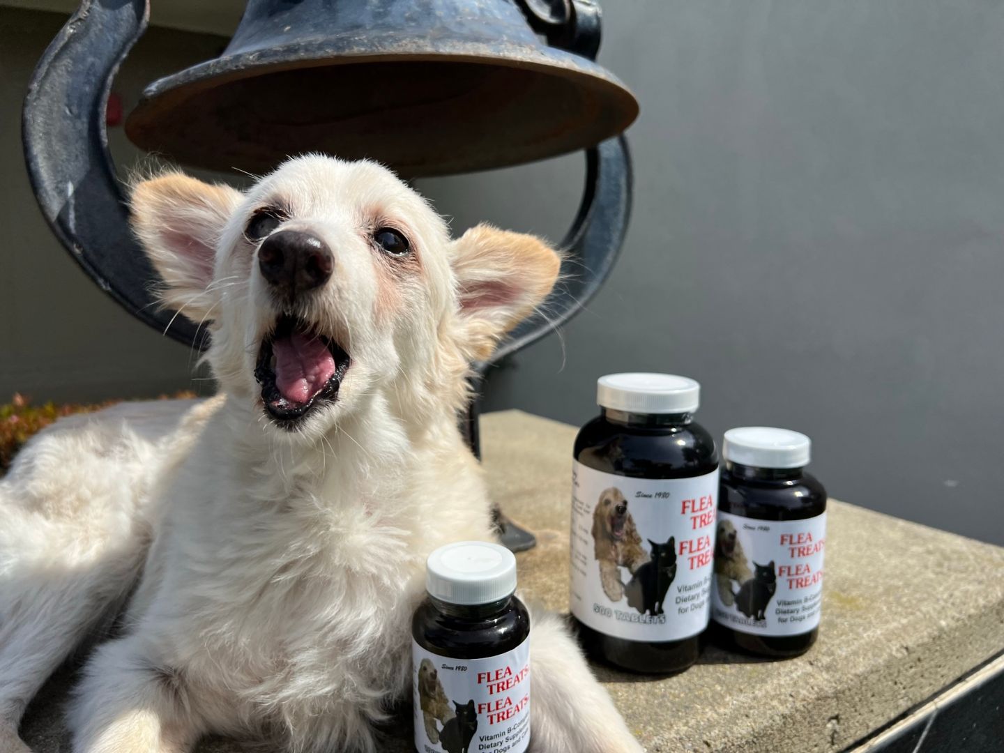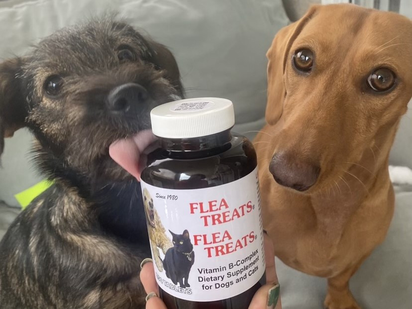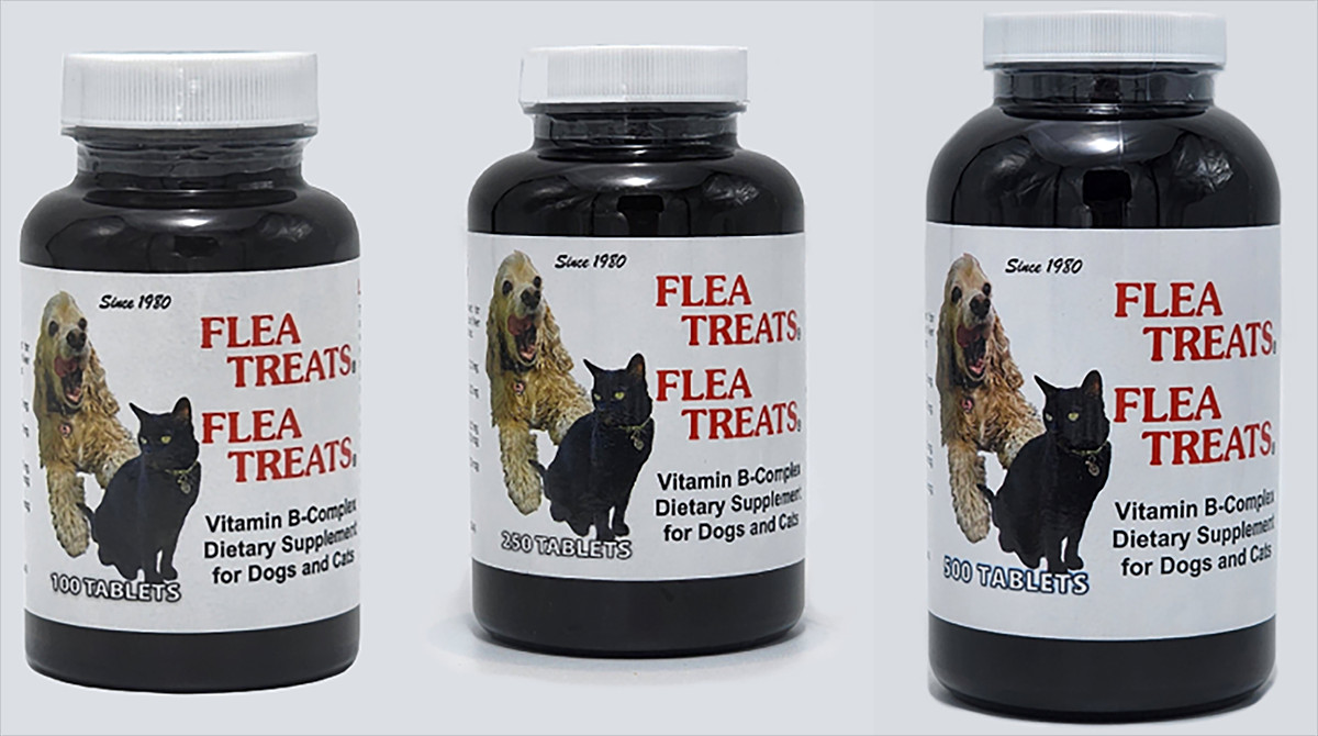 Flea Treats has been around since 1980. It is a vitamin B-complex dietary supplement for dogs and cats containing brewers yeast and real liver. Given twice a day, animals develop skin cells that smell bad to fleas. There are no insecticides or hormones and since B vitamins are water soluble, there is no risk in giving too many. The real liver makes them a treat that pets love. The only side effect is a healthy coat and skin!!!