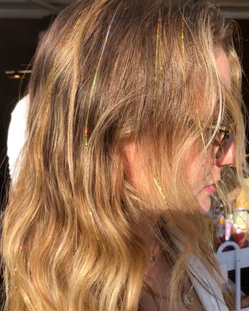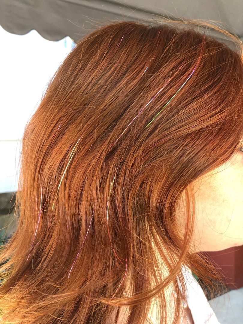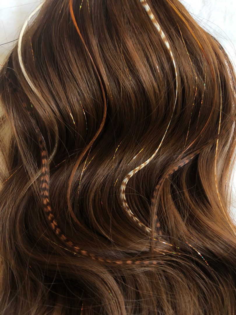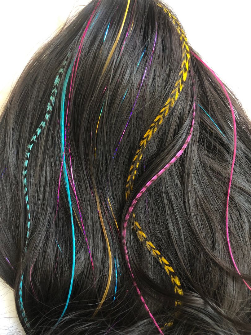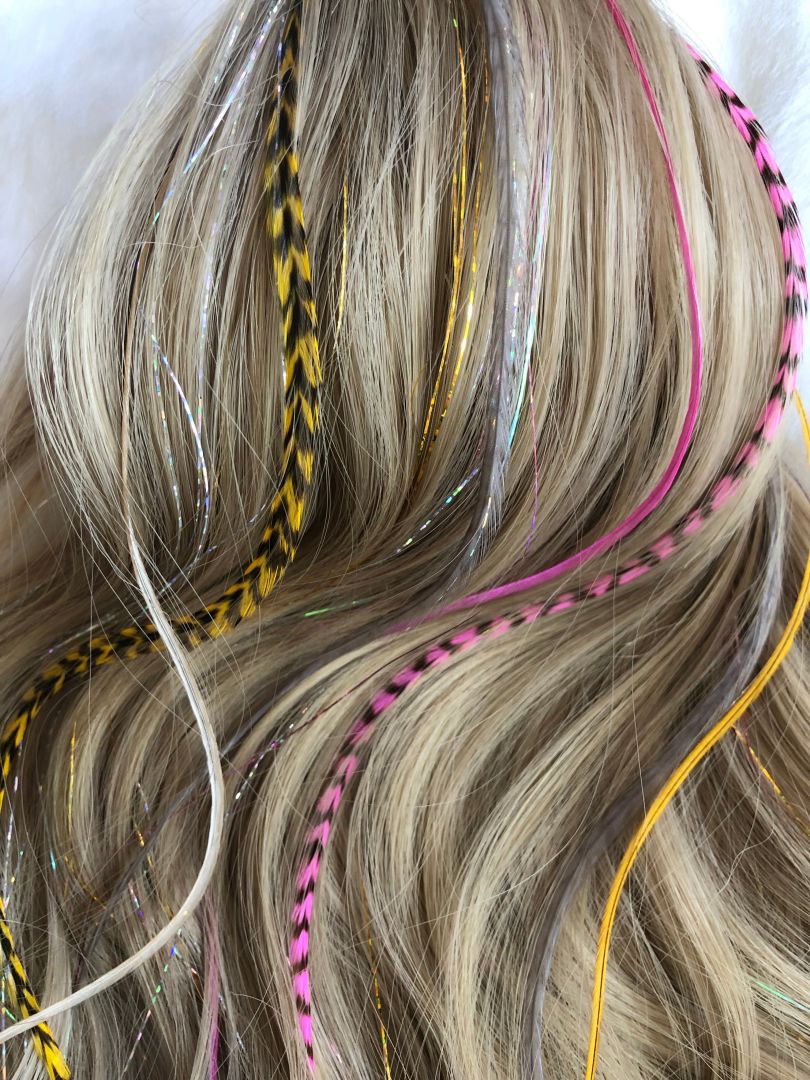 Glamorous glitter & funky feather hair extensions are a temporary way to make a permanent impression. My art is tedious, but extremely rewarding. I tie my glittery tinsel strands directly to the root of a few hairs with a series of knots. The feathers are attached with a silicone bead matching the color of your hair. Both can be washed, blow dried, straightened and curled. I offer 18+ colors in the glitter tinsels, as well as solid and grizzly authentic rooster feathers from the USA in natural and rainbow tones. The glitter tinsels last between 3-5 weeks, and the feathers last until they are removed; plus, they’re reusable. I love how trendy and unique my art is!