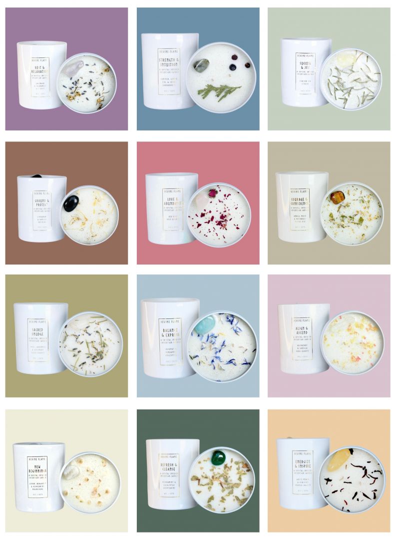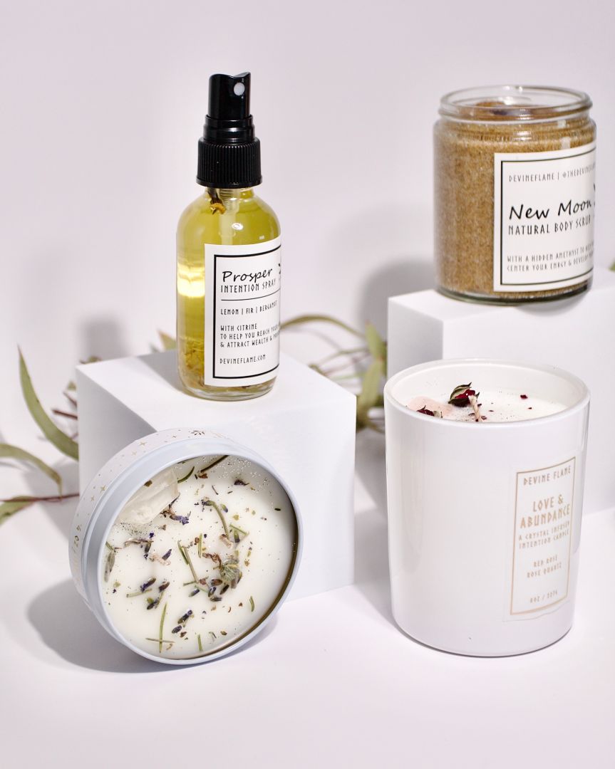 Devine Flame is my passion project, where I create truly special self-care products. Our range includes intention-infused goodies like coconut wax crystal candles, bath & body products, exquisite crystals, and captivating apothecary items.
