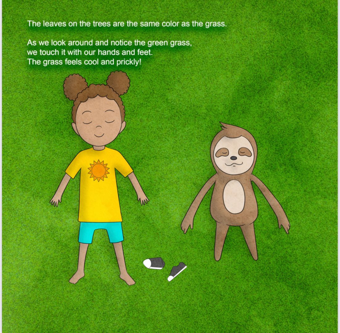 Book page artwork (girl and sloth laying on grass)- Aaron Harris-Wiggins