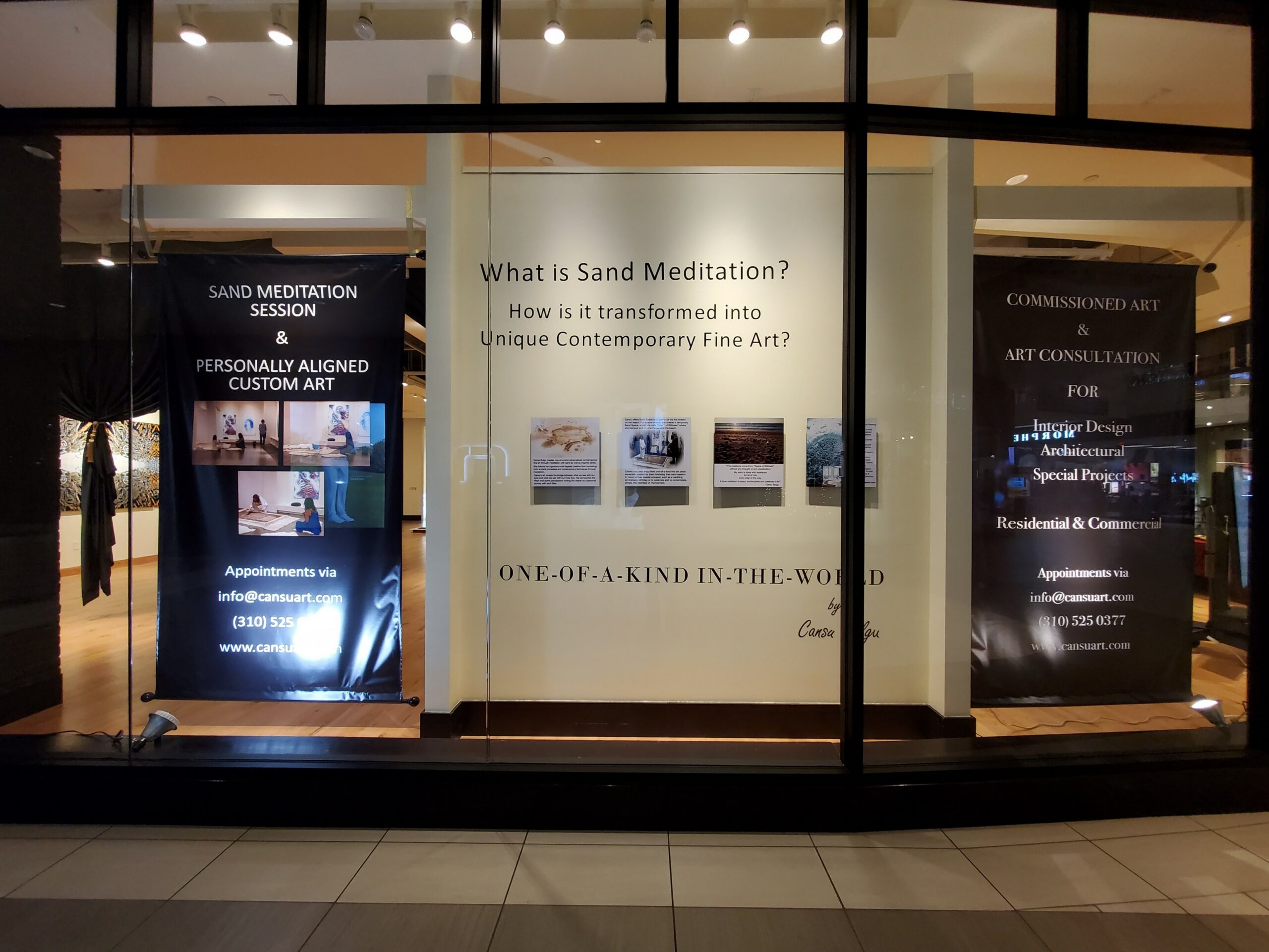Most recently, Cansu∞Art™ Gallery opened in Del Amo Fashion Center and enjoyed 8000sqft. Located in the high-end area of the mall adjacent to Nordstrom and across from an interior design company, Cansu∞Art™ Gallery served as a fine art gallery and a retreat center in an unexpected place for two years. The gallery was listed as a museum in the city guide due to its awe-inspiring presence and ability to attract visitors from all over the world that came from LAX airport. You can see some photos of it on my website.