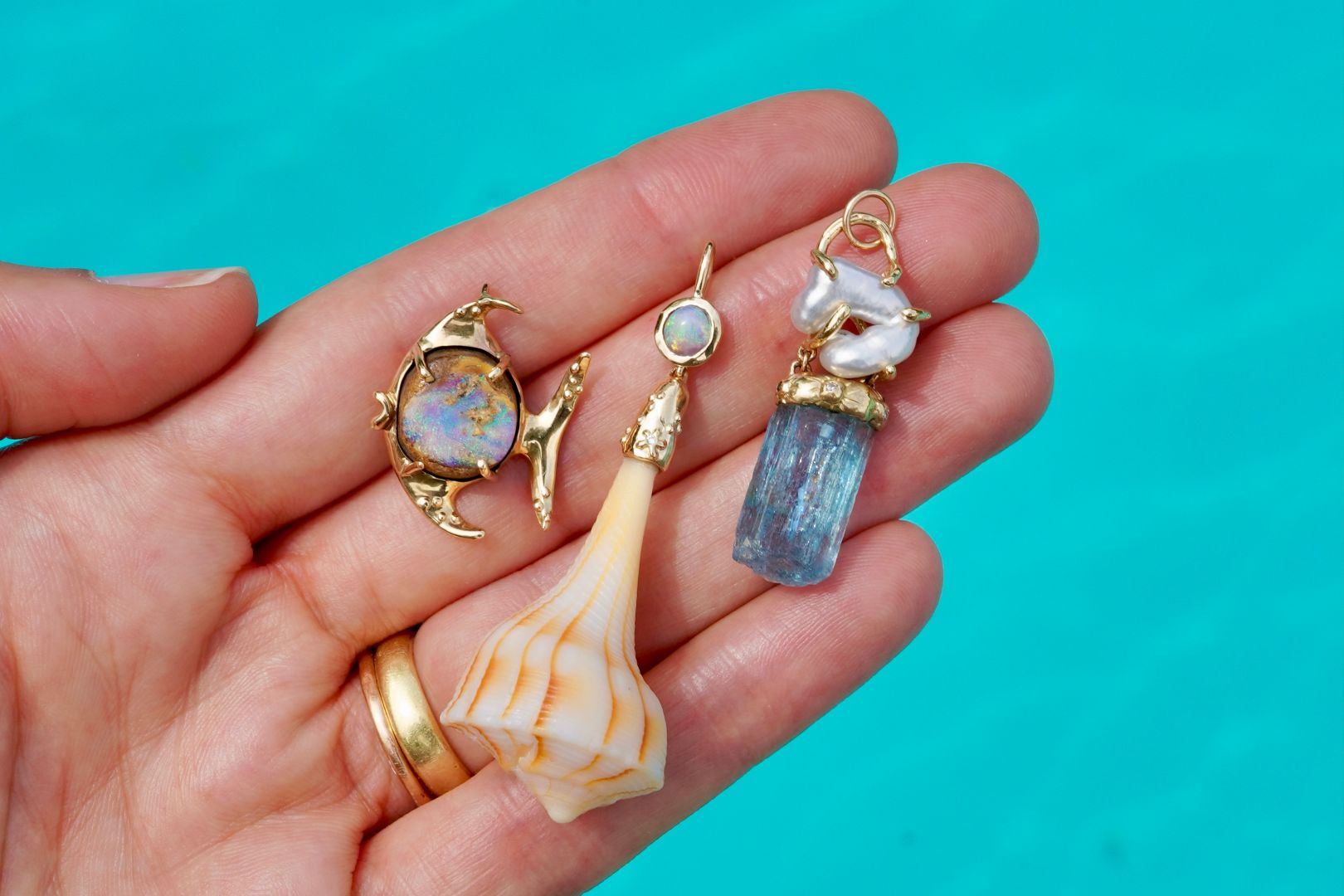 The ocean has always been my muse and caring for it is my passion. I am endlessly grateful to be able to tie together my love for sparkling adornment and gifts from the sea… And each MPD capsule collection of 14k gold, fossilized sea life, and a rainbow assortment of opals and gemstones feels like a natural step in the process of creating from my heart. Most recently I’ve been releasing capsule collections featuring the childlike wonder of naturally found seashells, the glow of the moon, the strength of the rising sun, and folklore surrounding aquamarine through history. I get so excited when I see clients mixing and matching various elements and styles from their personal treasure trove of MPD. They’re choosing the strength of an amulet or joy of a rainbow to start their day, and I can’t help but wonder if these pieces are worn to soothe the soul or push them with the energy of the crashing waves.