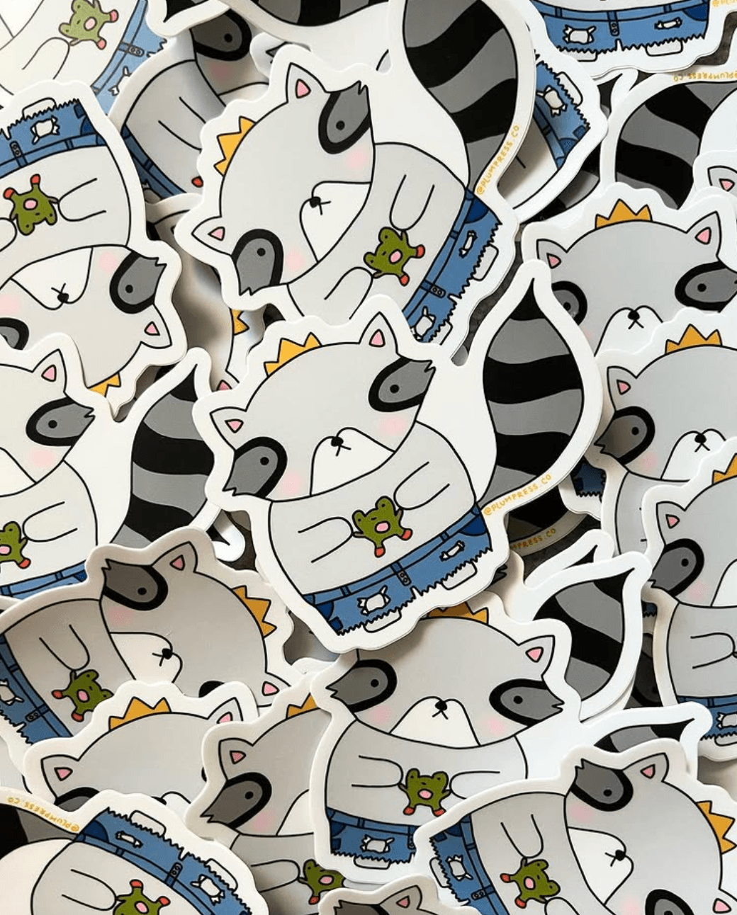 At this point I was drawing with pencil and paper and colored pencils, but I wanted to learn digital illustration. I spent hours and hours teaching myself how to wield my digital pen. So much trial and error and frustration! When I became more confident with it, I illustrated what would become the first ever Plum Press product and one of my best-selling stickers: Poppy & Mops, a jorts-wearing raccoon and her little frog pal. I researched sticker vendors, ordered samples. When I decided on a vendor (a process in itself!) and finished my first collection of drawings, I ordered a big ol’ batch of stickers and finally opened my store.