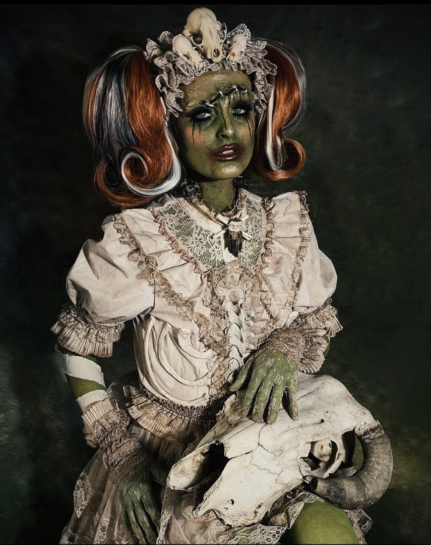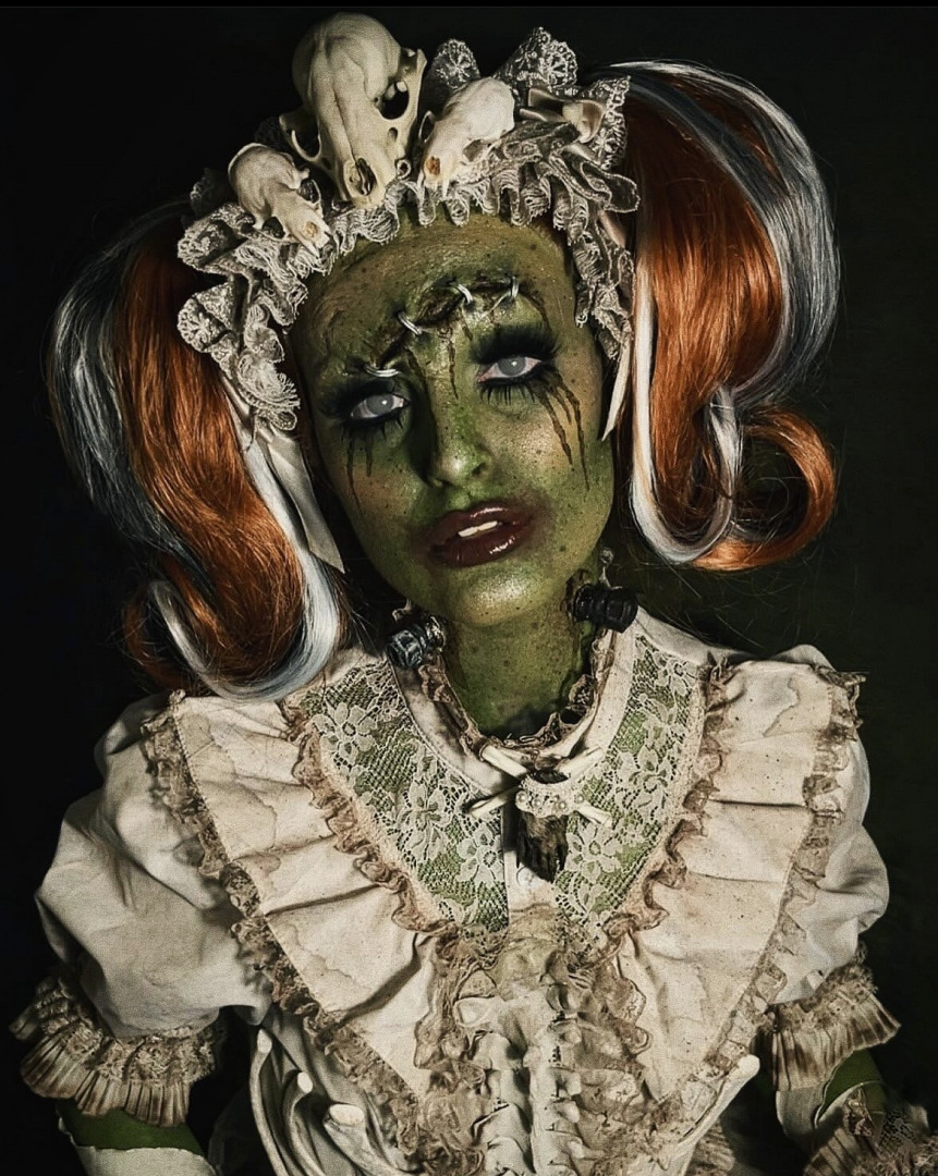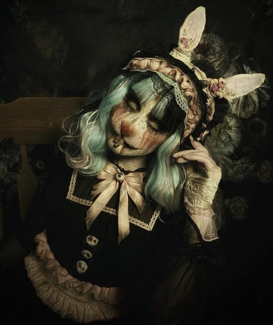 My love for horror / dark art started when I was a kid, all thanks to my mom. She introduced me to horror films at a very young age. I’ll never forget when she would play movies like the Exorcist, Mommy Dearest and all of the Scream/ Halloween franchise. Then she showed my siblings and I Tim Burton and Laika Studios movies. The visuals, the weird beauty, the artistry- it felt like it was made for me. My mom never made me feel strange for loving that world. She embraced it with me. She gave me the space to be drawn to the creepy, the emotional, the unconventional. I’ll always be grateful to her for showing me that there’s beauty in the weird, and power in being different. When I was 10 years old my mom let me have Facebook, my first social media ever and I was amazed when I found the world of dark artists. I’ll never forget the days that I found artists like Michael Hussar, Mark Ryden, Jasmine Griffith aka Strangeling and Llewellyn. These artists have inspired me throughout my early teen life and still do. I’ve always been drawn to the macabre and anything dark and dreary. In 2019, I created my makeup account as a way to express that love, and since then, I’ve been steadily building and refining a style that feels deeply personal and true to me.