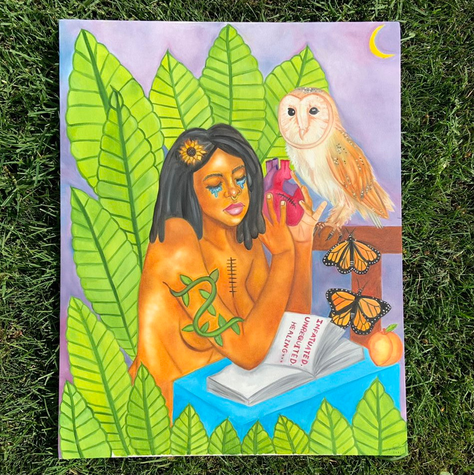I’m a visual artist and painter. My main mediums are oil and watercolor, but I’ve also used acrylics, colored pencils, and alcohol inks in my work. I don’t want to limit the ways that I express my creativity, so I’m always excited to explore new mediums. I try to be my most authentic self whenever I’m creating my art and truly paint what I’m feeling. My current work is focused on the healing process after heartbreak. I’m excited to be on this journey and I’m proud of myself for not settling into a career that isn’t fulfilling for me. I had previously worked in television and had realized that it was a career that I was no longer passionate about. I took a risk and moved to Los Angeles from my small town in Maryland to pursue a career in visual art. The journey hasn’t been easy and I’ve struggled with self-doubt, but I push myself to keep going because I truly love what I do. I know that one day my persistence will pay off. I’ll always paint regardless of what monetary value is or isn’t placed on my work. I’ve learned that my journey is my journey. It’s not supposed to look like anyone else’s and I shouldn’t compare my journey to others.
