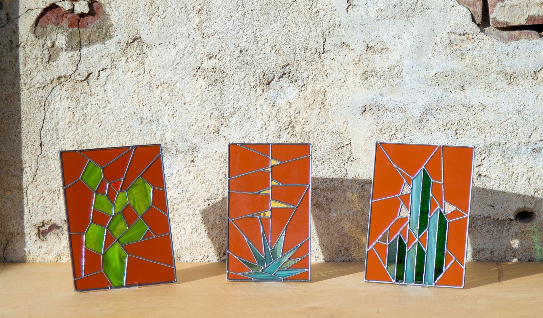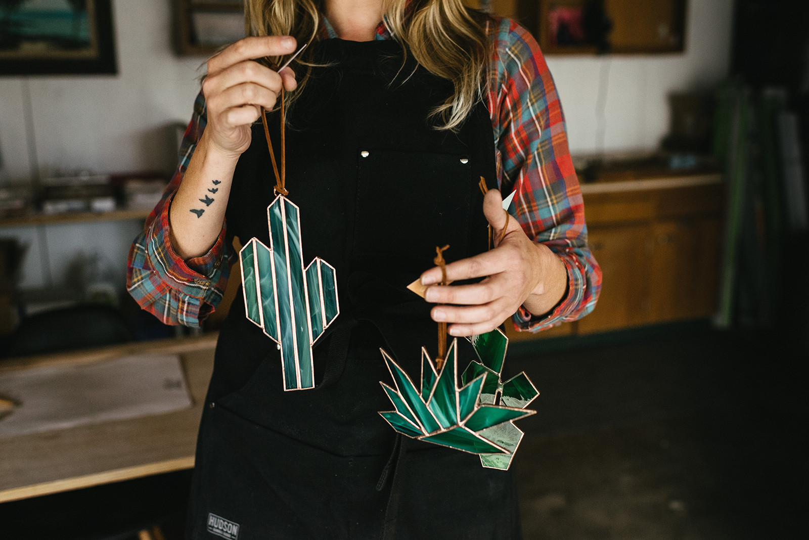 My dad started his own business when he was fifty years old. And it was seeing my parents carve out their own path as successful small business owners that, at a young age, really showed me, I can make a living doing whatever I wanted to do, whenever I wanted to. So, when I was thirty-four I moved from L.A. back to my hometown, took a stained glass class, and instantly fell in love with it. I bought all the tools I needed for a humble at home “studio” (let’s be honest, it was a small table in my parents garage, above the dog kennel, next to the washer and dryer) and started making my own designs and sharing my finished projects on social media. I wasn’t intending on selling anything initially, I was just a person proud of what I was making and sharing it with friends and family. But once strangers and shops started contacting me for work I knew I was making something they wanted, and that there was a real market for a modern take on traditional stained glass craft. So, I had to give the “stained glass as a business” idea a real shot.