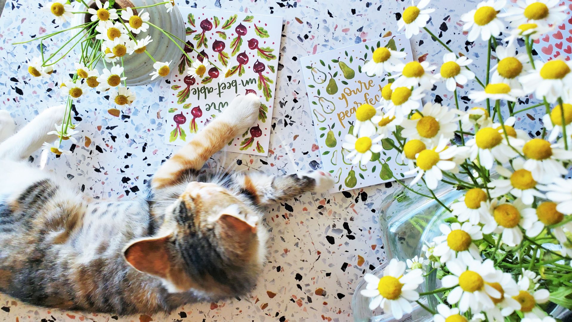 My artwork is all done with watercolors and hand-lettering on paper. In the last year I’ve been playing with more digital drawing in very small doses but I primarily do all my painting on paper, then scan and edit on my computer before sending it off to the printers.