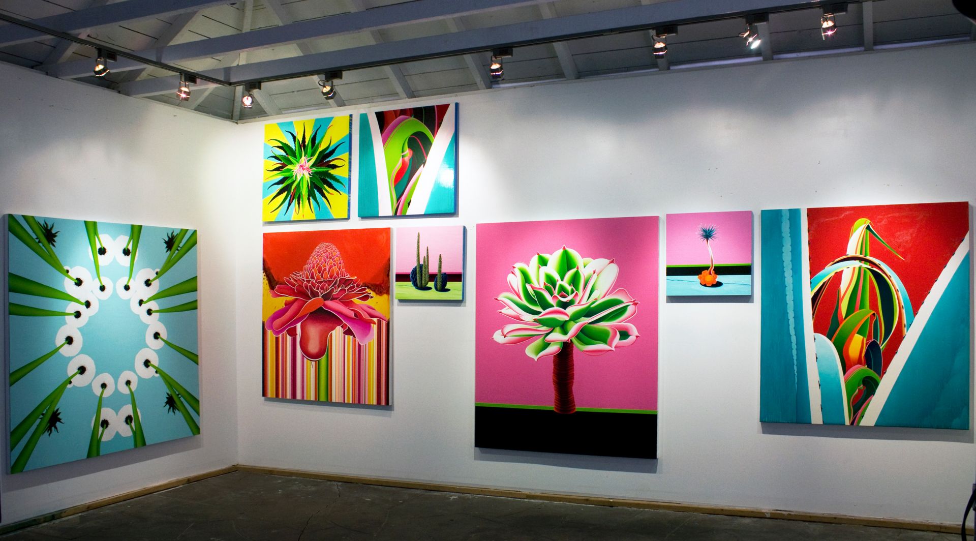 The current work with which I am engaged merges my interest in painting approaches with a love of the (mostly) drought-tolerant plant specimen that I have used in landscape re-designs at several LA residences. These specimens are gorgeous and they inspire me. In my paintings I play with the images, altering them from their original, “natural” states: parts have been removed, re-arranged and enlarged; the color has been re-interpreted or exaggerated. Abstraction and the almost-natural interact within a single space, resulting in paintings that play on the surreal. This, for me, is a nod to the conditions in which we find ourselves today.