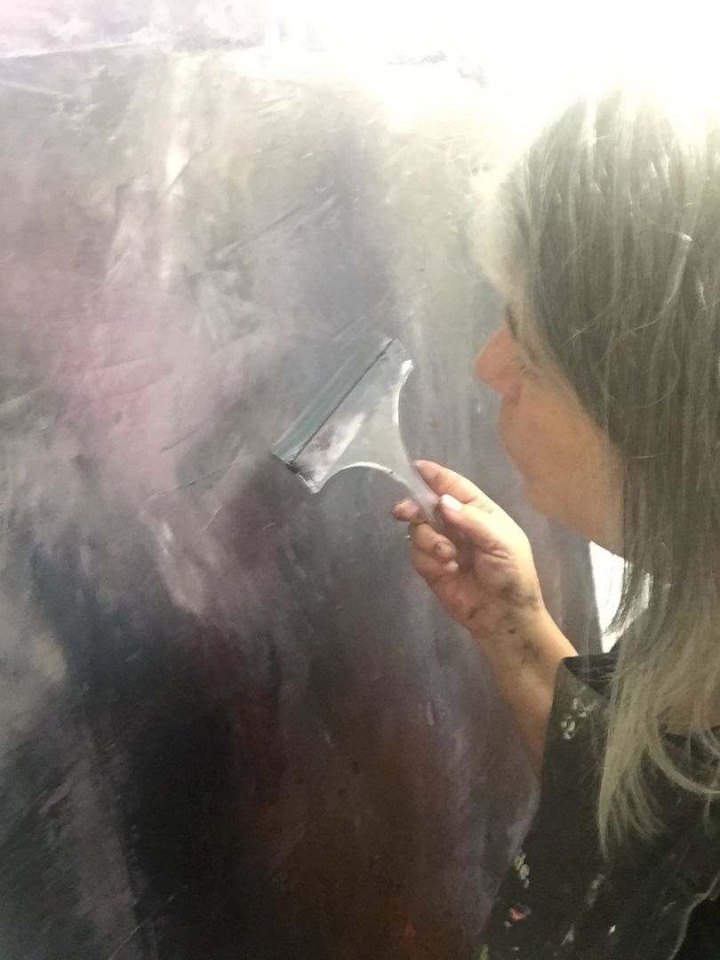 A few years ago I started working with cold wax medium with my oils. Cold Wax allows the artist so many options: you can imprint, scratch, texturize – all types of mark-making that aren’t quite as successful with plain oil. I’ve been using a palette knives for about 5 years and since then, have added squeeges, old plastic room key cards, brayers and anything else I can use to assist me in communicating. I’ve always created art – my first painting was done at age 12. I felt uncomfortable with color for awhile so spent a lot of time drawing.