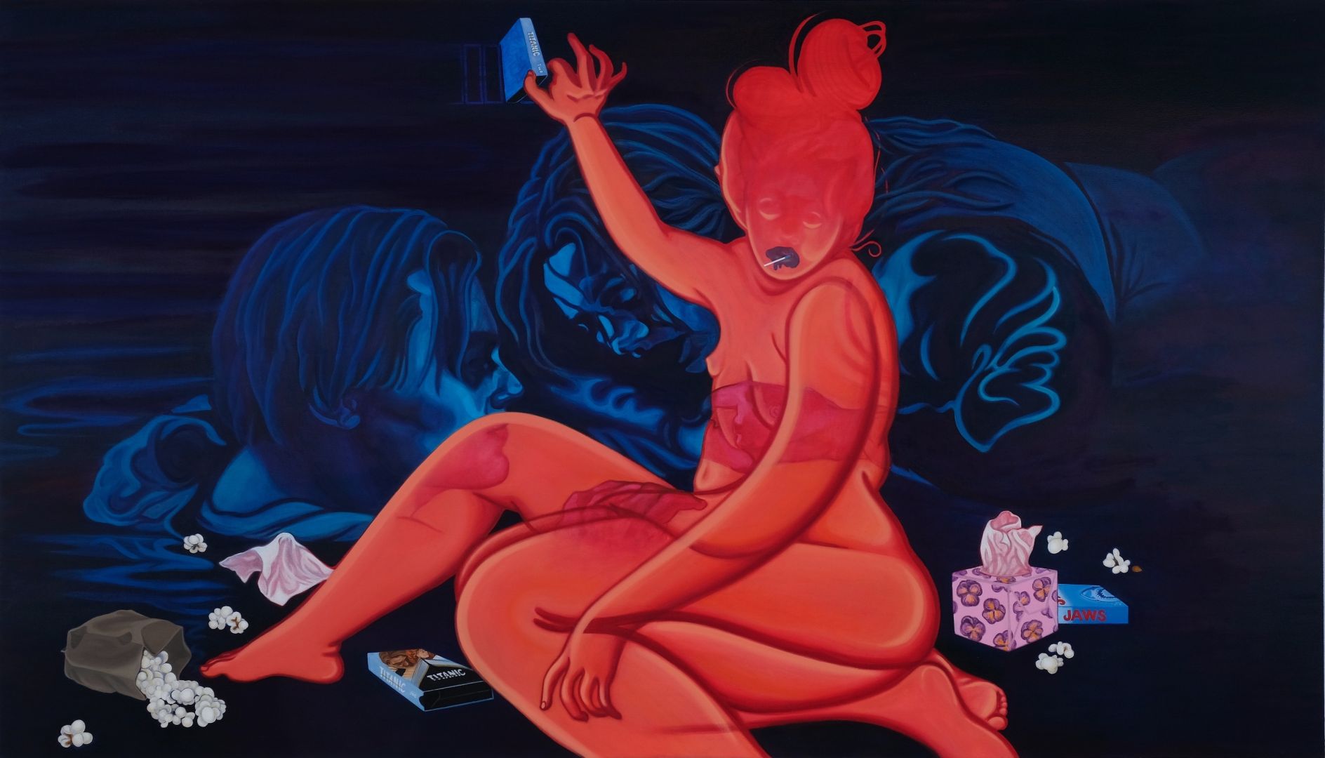 Additionally, the innate stillness of a painting or drawing has become a metaphor in its own right that highlights themes within the imagery. In a time that desperately calls for action, I am interested in the freeze response to being overwhelmed, the uphill battle to fight that catatonic feeling in the face of high anxiety, and who that inertia ends up hurting: ourselves, but also our community. I believe these themes are especially resonate with the women who are subject to the paintings, movies and books from which I am inspired. In grappling with the “ingénue,” the “reclining nude,” the “bather,” or the “pin-up,” I contend with the appeal of her lethargy, and the performance, versus the reality, of relaxation, distress, and apathy.