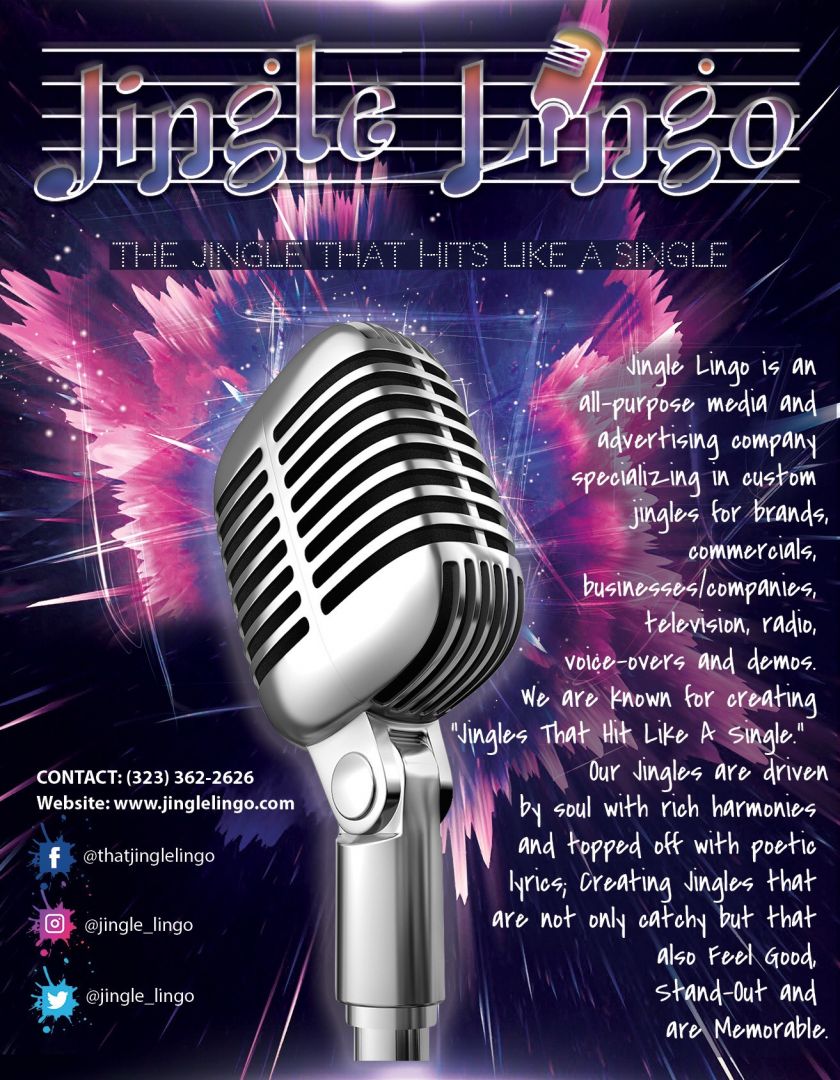 Jingle Lingo is an all-purpose media and advertising company specializing in jingles for brands, commercials, businesses, companies, radio, voice-overs and demos. Let’s not leave out those special occasion Jingles for that special person or event. While we’d love to one day tap into television and movie soundtracks, our current focus is catering to new and small businesses that may have limited budgets for advertising markets. Our goal is to support and uplift others; getting their brand recognized… while making Jingle Lingo the “Go To” Company. Think about it… we subconsciously take to music and lyrics faster than any other source. Music is an EMOTION – a feeling of nostalgia and is also contagious. Our jingles are catchy and promote “Feel Good Music.”