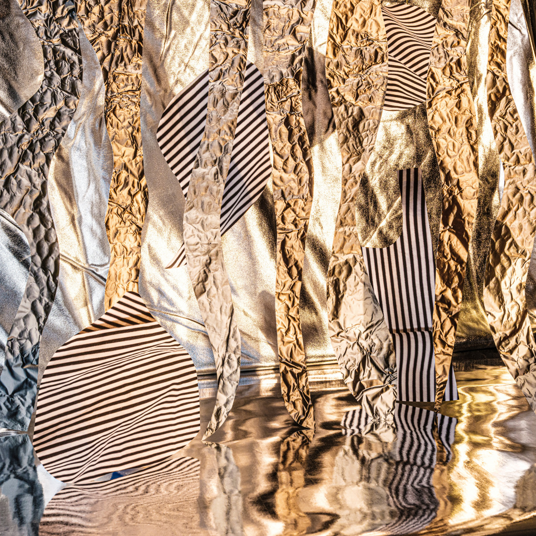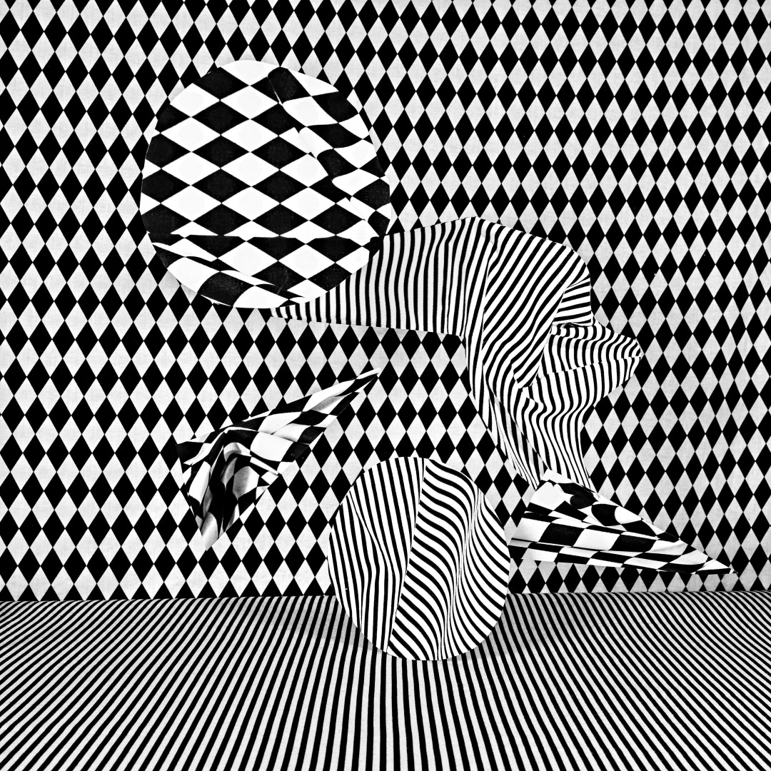Through a kind of still-life photography, I play with pattern, distortion, and material tension to probe how perception organizes experience. My process diverges from traditional photography: I shoot commonplace objects, patterned fabrics, and reflective or textured materials; print them out; cut them up; and collage the fragments into sculptural arrangements. In the studio, I’ve built a structure where I can hang and “sculpt” these cut-up shapes. Once the staged composition feels right—which can take days—the shutter is pressed, and physical and optical phenomena collapse into a single frame.