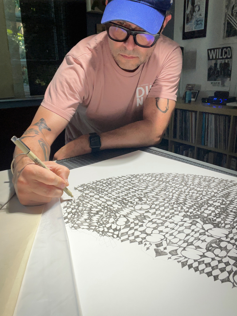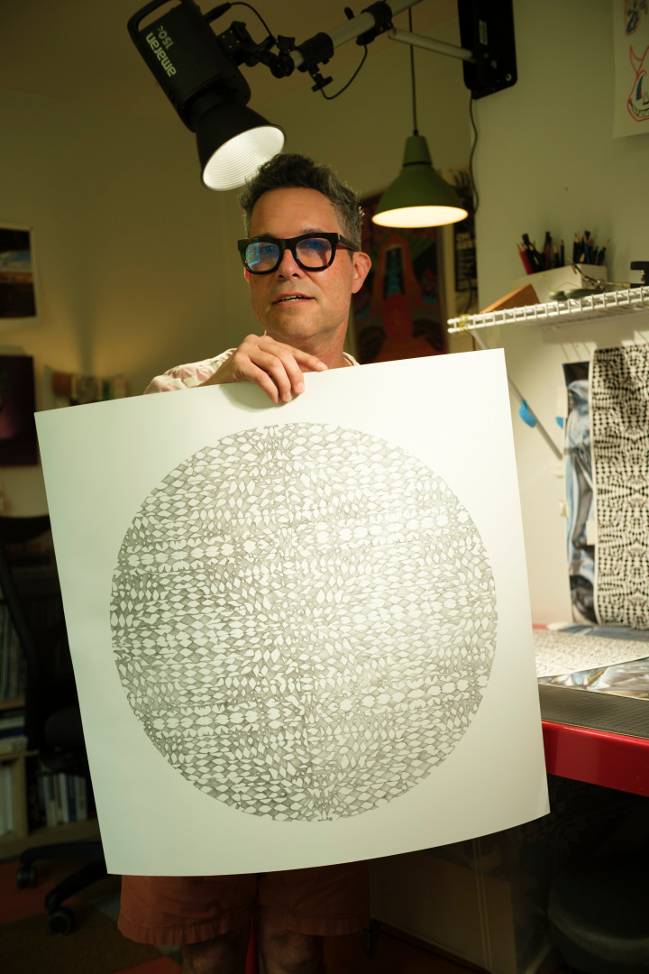 My recent drawings grew out of this photographic practice. At first, they were a way to create new patterns for the photographs, but I soon began to value them on their own terms. They draw from Op Art, wave interference, and Turing patterns, while also nodding to psychedelic and mystical experience. I love how they appear perfectly symmetrical at first glance, but reveal subtle imperfections upon closer inspection.