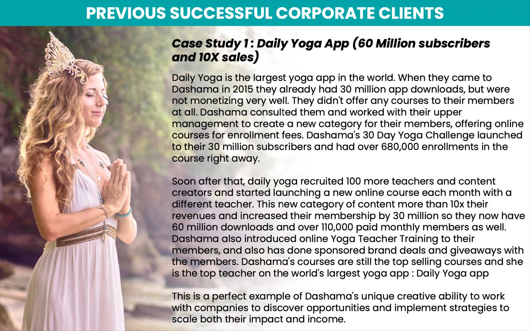 My journey was lead by passion and even though there were a number of challenges along the path, it has been the most rewarding and nourishing healing journey to be able to help millions of people discover the transformational power of Flow State yoga and lead them to become certified teachers as well. My teaching has impacted over 100 million people across my partnerships including Daily Yoga app, I am the top yoga teacher to their 60 million subscribers, and Curejoy Ayurveda on FB, with nearly 10 million fans, etc.