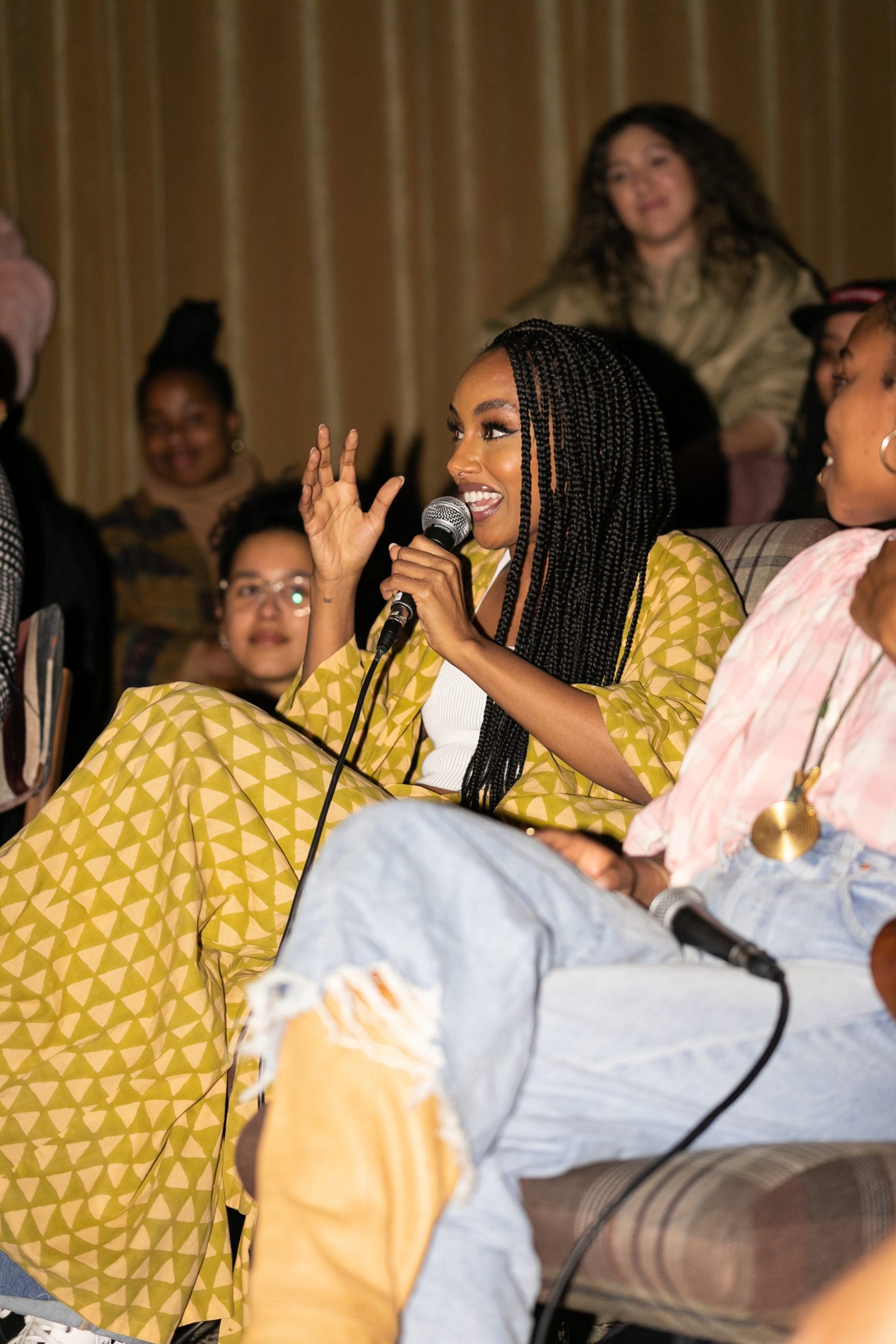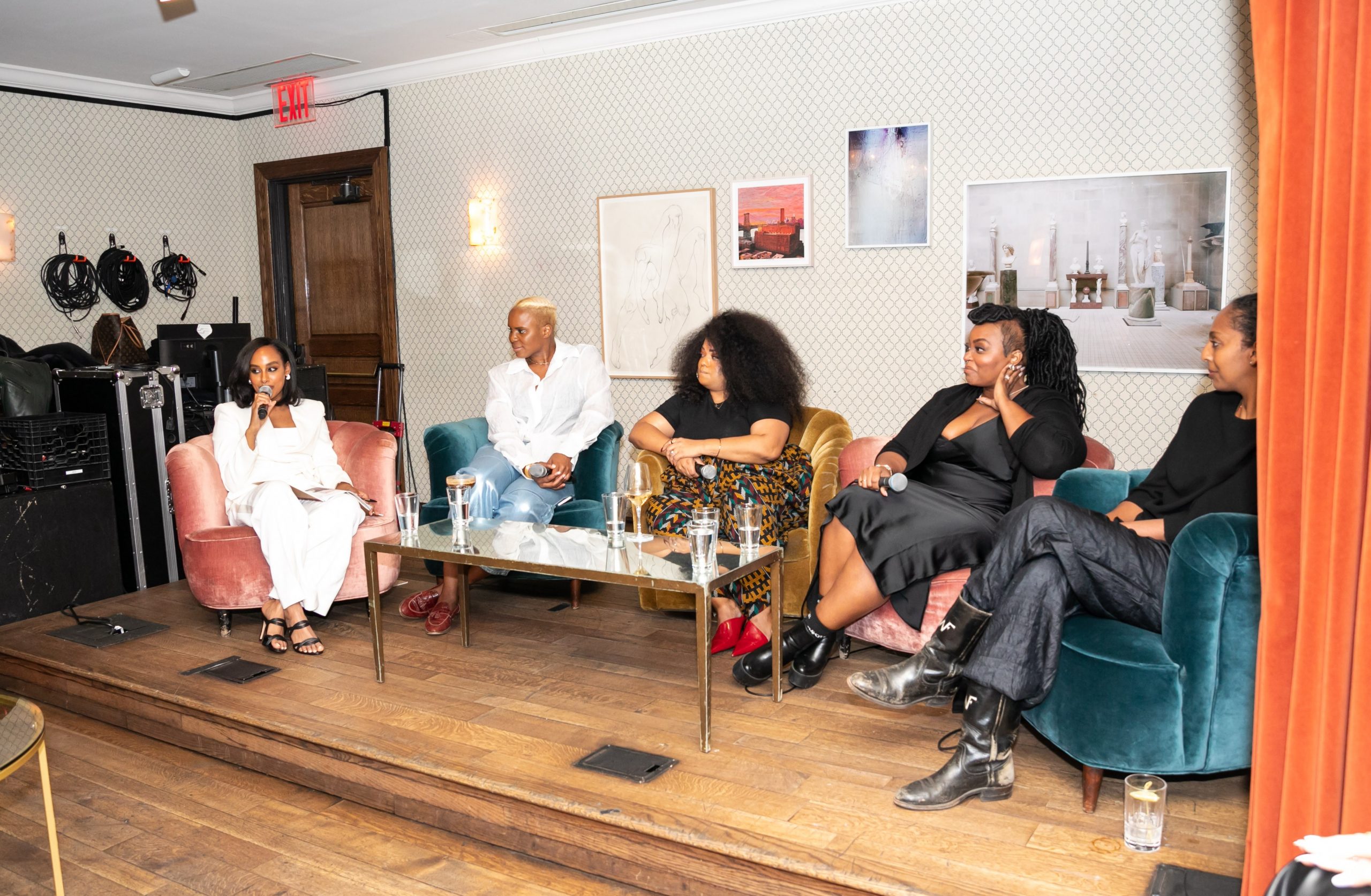 @blackbeautyclub (sitting down with the mic and patterned dress, white suit)