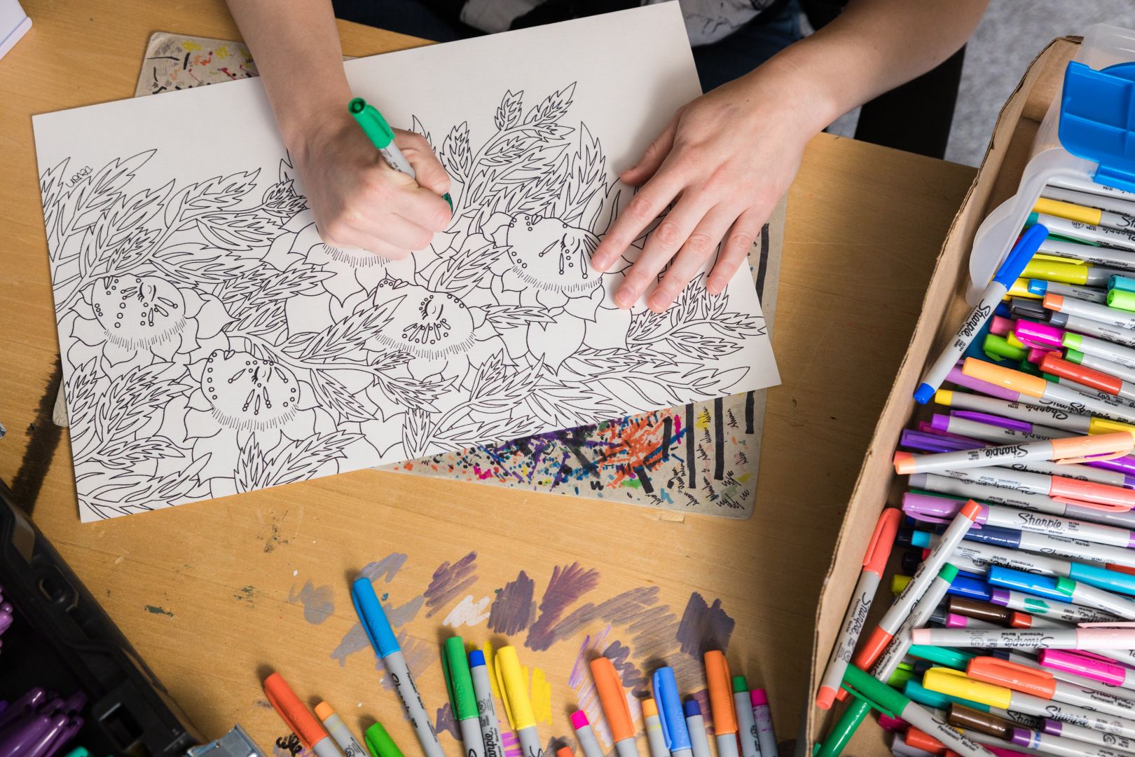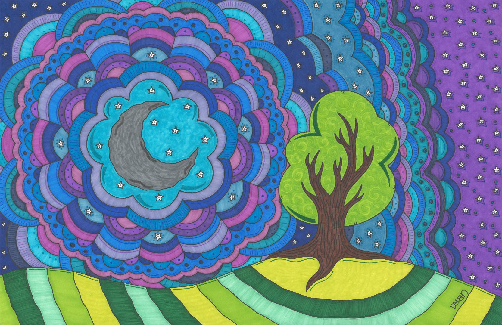 I am a self taught artist with a love for animals and weird things. I use my passion for color to create abstract art pieces that take the mind on an adventure. My medium of choice is markers, mainly Sharpies, with a spcialty in creating textures through a process of layering. My style is a unique mash of Dr. Suess’s style, Peter Max’s colors, and Van Gogh’s textures, it truly is one of a kind.
