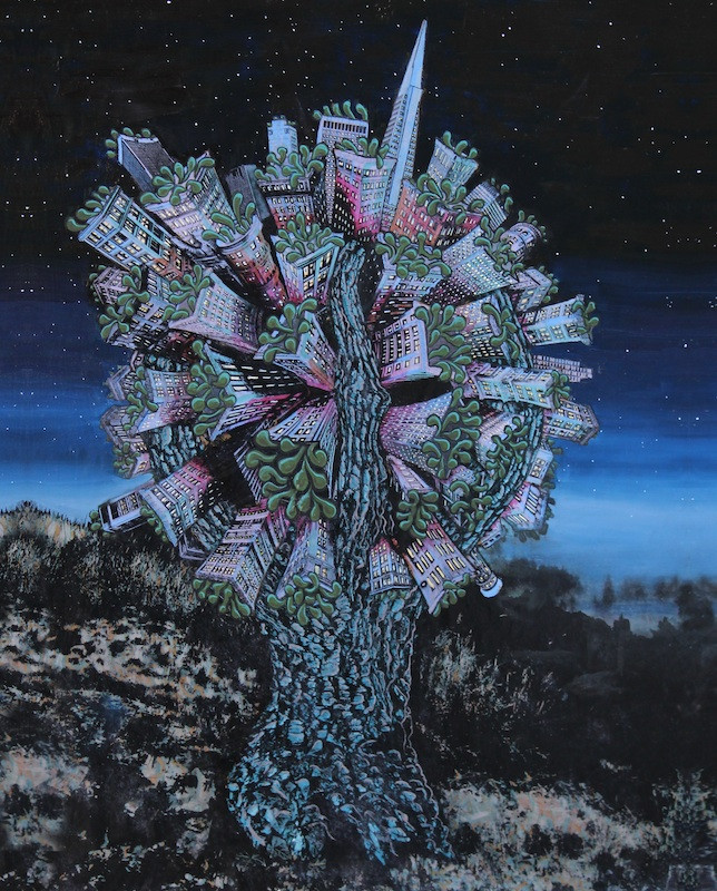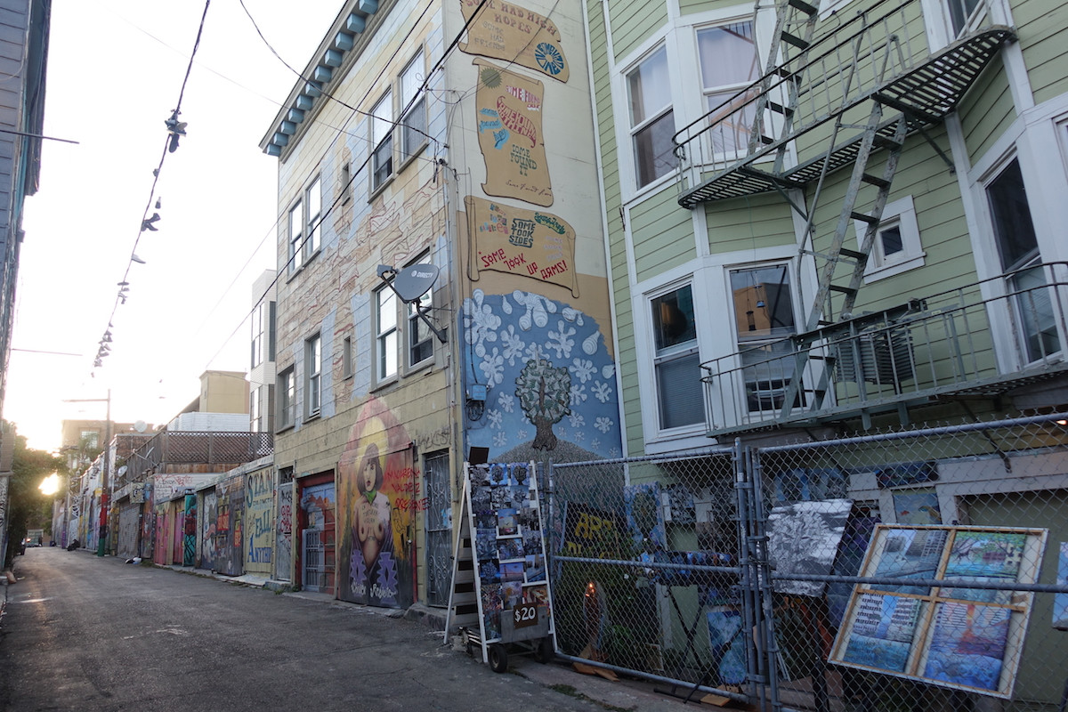 I live in the Mission District of San Francisco. and mostly I would take a visiting friend around my neighborhood. Based on what their cravings at any particular moment would be for food we have burmese, indian, Thai, Japanese, Chinese. and all the fusion inbetween, Not to miss the Mexican, Nicarauguan, elsalvadorian food. For dinks we could go to several bars based on the vibe from shwanky to dives from punk rock to jazz. My studio is located in Clarion Alley where you the alley is filled with murals usually with a messages about different concerns the artists have with our society and world.