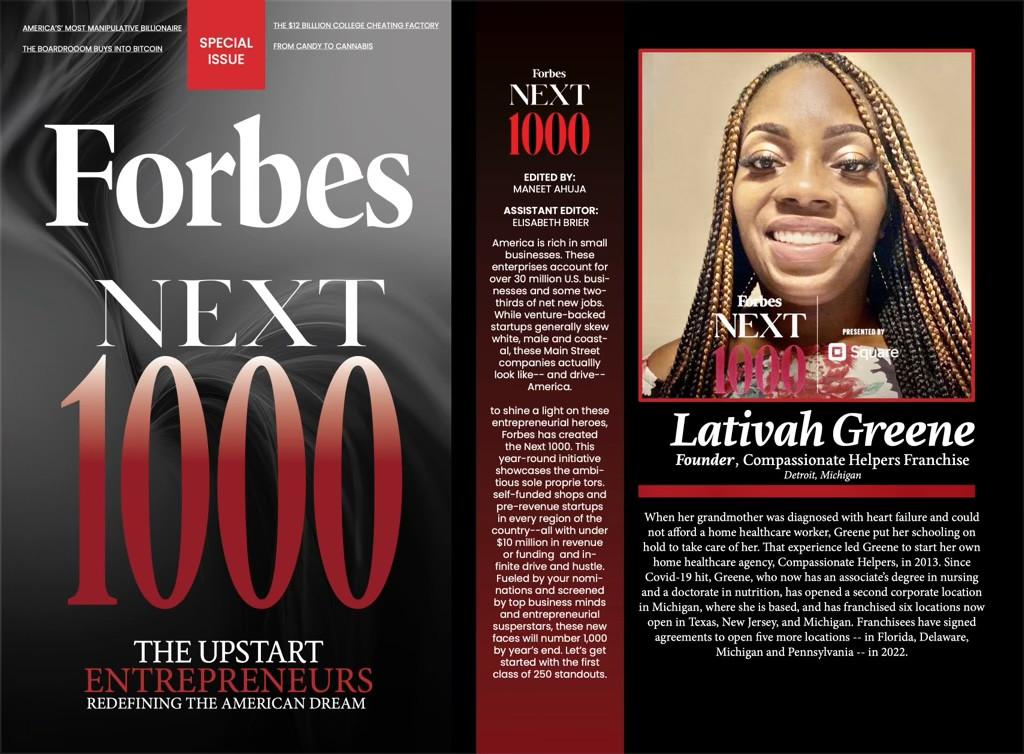 My story : Earned Doctorates in Nutrition at age 27 , First black woman to own home health care franchise corporation with 14 locations around the USA and 1 location in Canada. Awarded Forbes Next 1000 Honoree , Nominated to be featured in Detroit Historical Museum , Healthcare 2.0 conference Outstanding Leadership Honoree , and More .