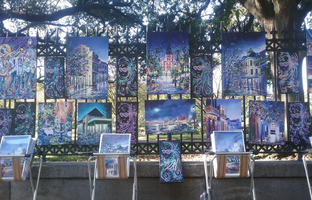 If I had a friend that’s never been to New Orleans before we would start with the jazz brunch at Court of Two Sisters followed by the Dukes of Dixieland Jazz Band on Bourbon Street. We then head up to the river and look at the Mississippi River from the moonwalk while eating Beignets from Cafe Du Monde. Next day Napoleon House for the roast beef Po Boys… oh my. After that a good City Tour driving around and showing all the stuff that the tourists don’t see. Day by day there are too many restaurants to list but some of the key food items are seafood pasta Coop’s Place is of my favorites. Who does without a muffuletta from Central Grocery. It’s deliciously yummy! And if the budget allows there’s nothing like Antoine’s Restaurant. Music wise checking the calendar for any local events that include music is always the first pick. If nothing’s going on we’ve always got Frenchman Street, Bourbon Street and the Uptown music scene. Attractions are always wonderful and because my artwork is featured at the Four Seasons Hotel attraction on the top of the building called Vue Orleans, I would definitely bring my friend there so she/he could be proud of the paintings I did to represent the New Orleans culture. I was very proud of that project and it really saved me economically during covid. I needed that job. And the truth is as a little girl I dreamed that one day my artwork would be in the building. Long ago the building was called the International trademart. It had art shows on the ground floor that I used to go look at as a little girl. Here it was many decades later and I am an old woman and I got to paint the paintings that are in the top of the building now. Kind of a dream come true. 😀