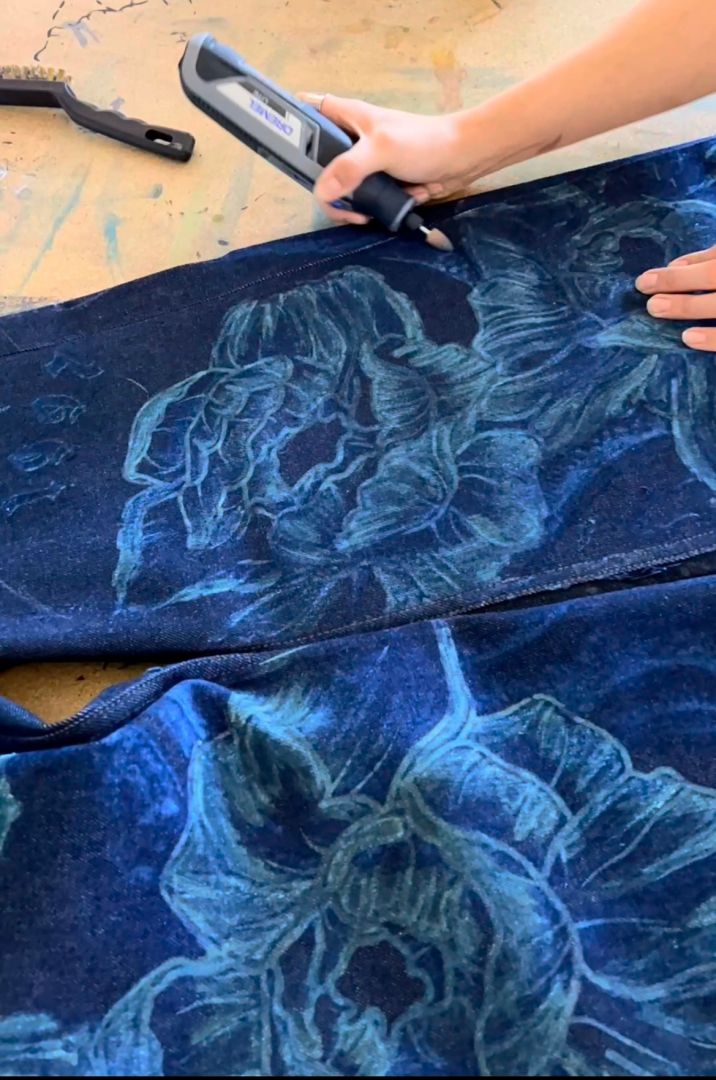 I create one of a kind denim pieces that have an artisanal textile spin through adding textures, hand drawn /dremeled embellishments, hand painting etc.. each piece being hand crafted with intention from start to finish.