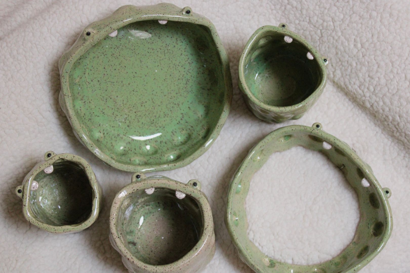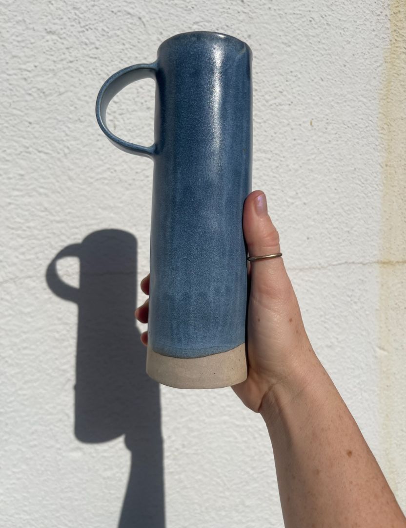 When I was younger my favorite thing to do was make tiny sculptures out of clay with sculpey clay, then in high school I played around a lot with real ceramics and loved it. I mostly made ceramic animals, which led to making my favorite animals- frogs. (Technically my favorite are toads but frogs are cuter, I don’t make the rules) So now my art leans on the cartoony side in the best ways. I went through a phase of making only frog things- bowls, cups, wall hangings. Now I’m in my car cup era. Car cups are my newest series of just super tall mugs that, you guessed it, fit in your car holder. I was sick of bringing my regular mug into the car and getting coffee literally everywhere and so Car Cup was born. They come in a ton of colors, most recently a beautiful blue that makes it look denim, us at the studio have been calling it the “Jup” or Jean Cup. I wouldn’t have gotten to where I am in the ease of making them without my studio friends. When I first joined the studio I was so scared of people commenting on my pieces/my technique being wrong that I would literally make all my pieces at home and just bring them in to be fired. WELL turns out you can totally do that but the growth happens in the studio. My mantra became “I am safe to be seen.” And VOILA! Studio members hit the scene. Studio babes Audrey and Kelly have been so major in this journey. SO many tips and tricks, some gentle suggestions, some not so gentle suggestions, but helpful and growth invoking nonetheless. The many members of Still Life have helped make me the artist I am today no doubt. There is never a drought positivity and it makes for the safest space. The encouragement you get from the members is what I hope everyone finds in their artistic field of choice