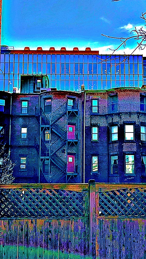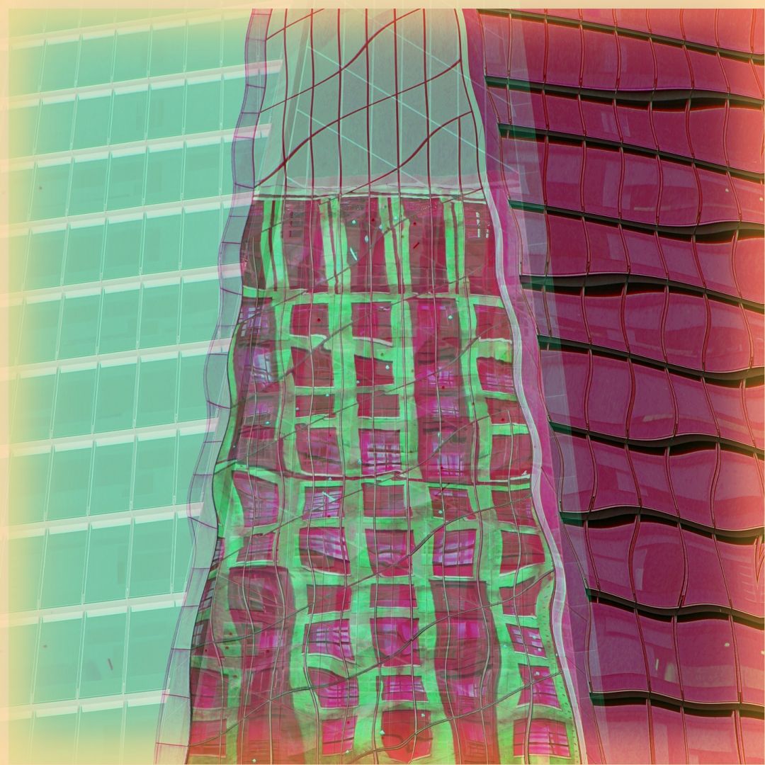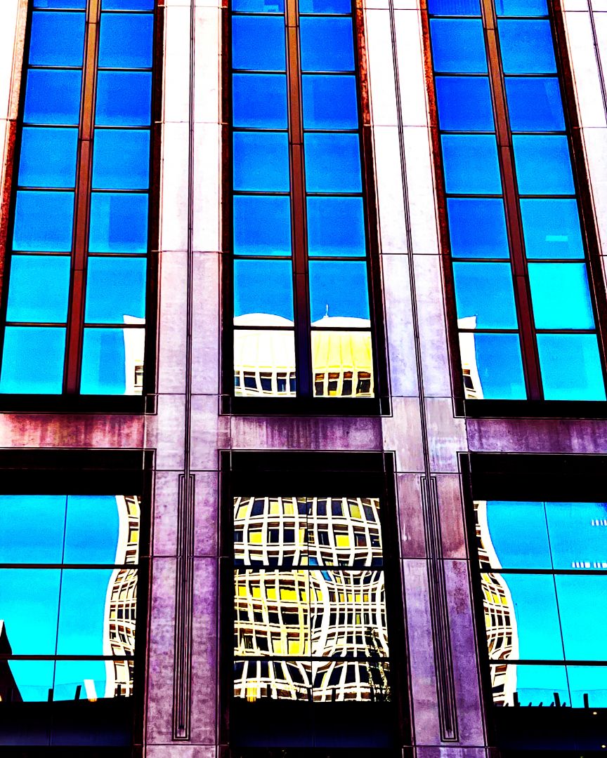 I then took the idea of reimagining the colors and shapes to the photos I took when I was out walking around on my breaks at work. By that time those walks were in downtown Springfield and I was being really inspired by the lines and angles of the architecture, the mix of older and newer buildings, and the way that reflections impacted my view of the city. These walks around the same areas over the course of time, the shifting seasonal light, the different weather, got me thinking about how I see where I live… it made the buildings more alive. I feel like, based on the colors and the manipulations, that I’m pulling personality and possibilities out. Reimagining how the city looks, and how the city could look and exist, changes the way I think about the realities in the city. It broadens the possibilities.