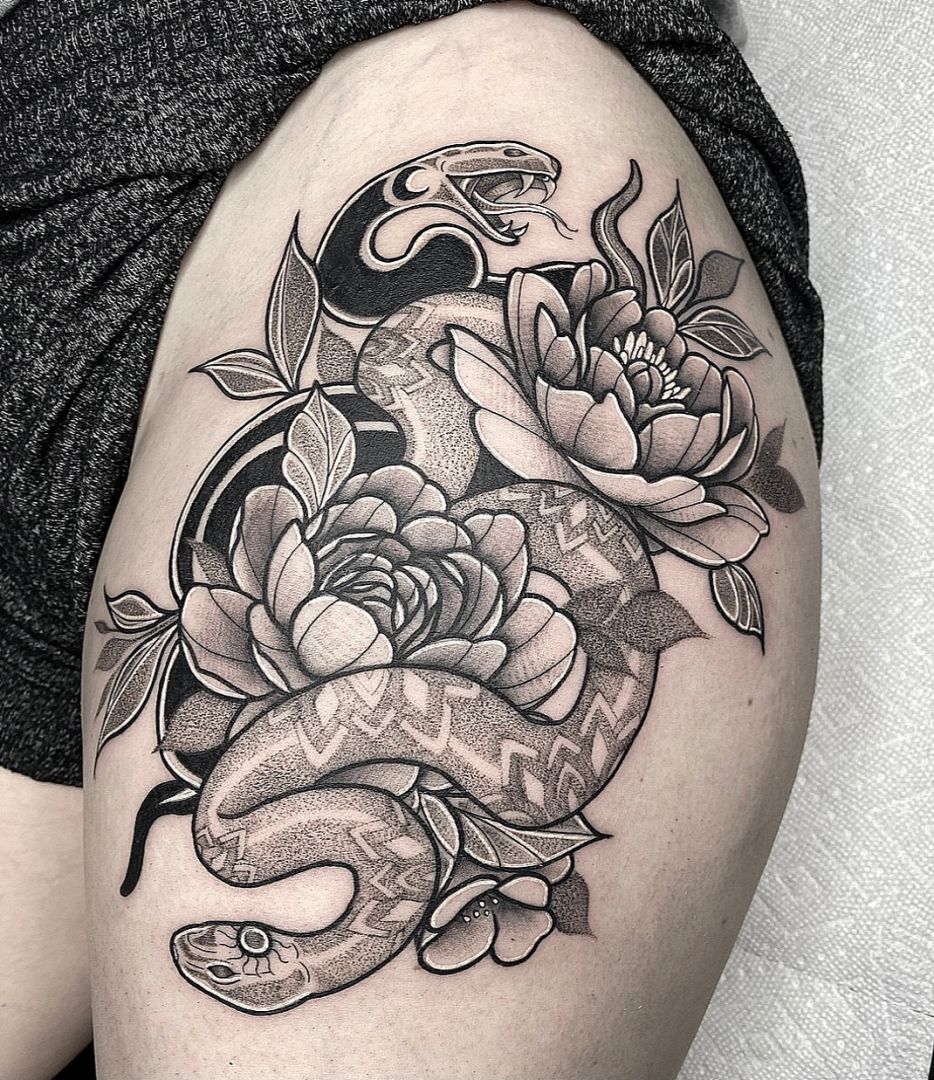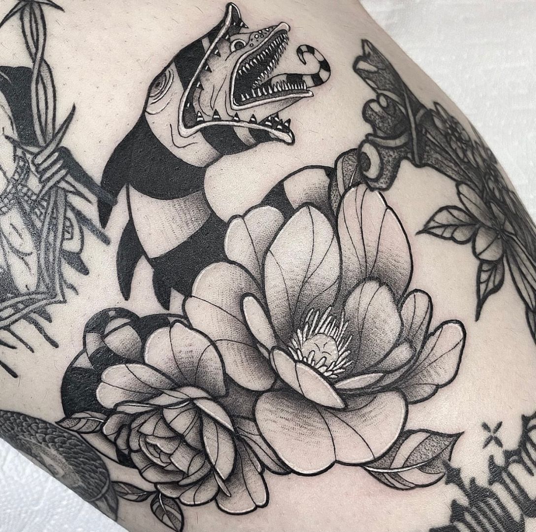 Getting to where I am now wasn’t easy, I was getting tattooed and hangin out at the shop for two years before I was asked if I wanted an apprenticeship, then it was a little over two years with no pay to complete my apprenticeship. Definitely had to have a side hustle through that lol so I would go work at the shop all day and then go home and make custom funko pops to sell, and not just the figure, my husband and I would make all the box art as well. I made lots of sacrifices through that time so that I could tattoo any chance I had. I eventually built up an amazing clientele who love my art, and my style of tattooing. I put my heart and soul into every tattoo I do big or small. Dreams don’t just happen, you have to put in the time and work for it to become a reality. Never give up, always keep pushing and the universe won’t let that go unnoticed.