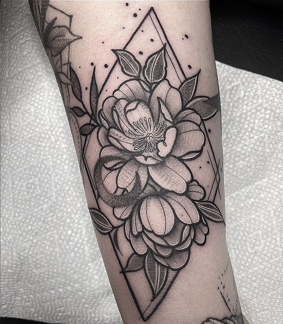 Making art and creating art literally makes my soul and brain happy. For a person like myself, other jobs that I’ve had were to constricted and I would always end up breaking rules whether I knew I was or not. I’ve been an artist ever since I can remember, always drawing, sculpting, painting or even just doing my makeup. When I was asked if I wanted to apprentice at Hard Knox Tattoo I knew I had to try. You gotta have tough skin in this industry especially as a woman so it was a scary transition but what I’ve learned is that tattooing isn’t just something I do, it’s a lifestyle and it’s been the best thing I could have done for myself and my family. I’ve been tattooing for four years and I’m still hungry, always trying to learn and better myself as an artist everyday. I absolutely love the tattoo life, it’s been a dream come true.