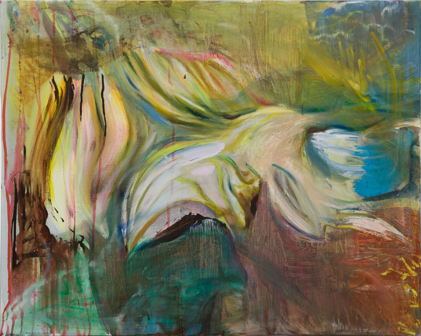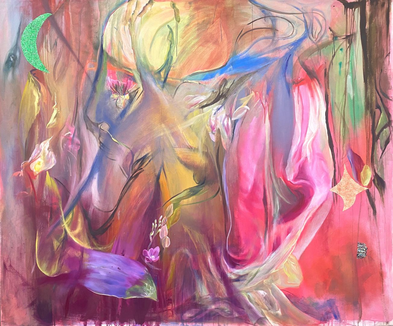 Though it’s a bit hard for me to go into too much detail about my art (mostly because I like to leave it up for interpretation), my paintings come from a place of curiosity and affinity for color. I use a lot of references that stem from overlooked, sometimes kitschy objects and particularly “gaudy” moments in fashion and art. I like to “zoom in” on particular moments from these sources of inspiration and collage the most interesting parts with paint and a paintbrush. Some natural elements–floral imagery and traces of natural landscapes–are incorporated as well.