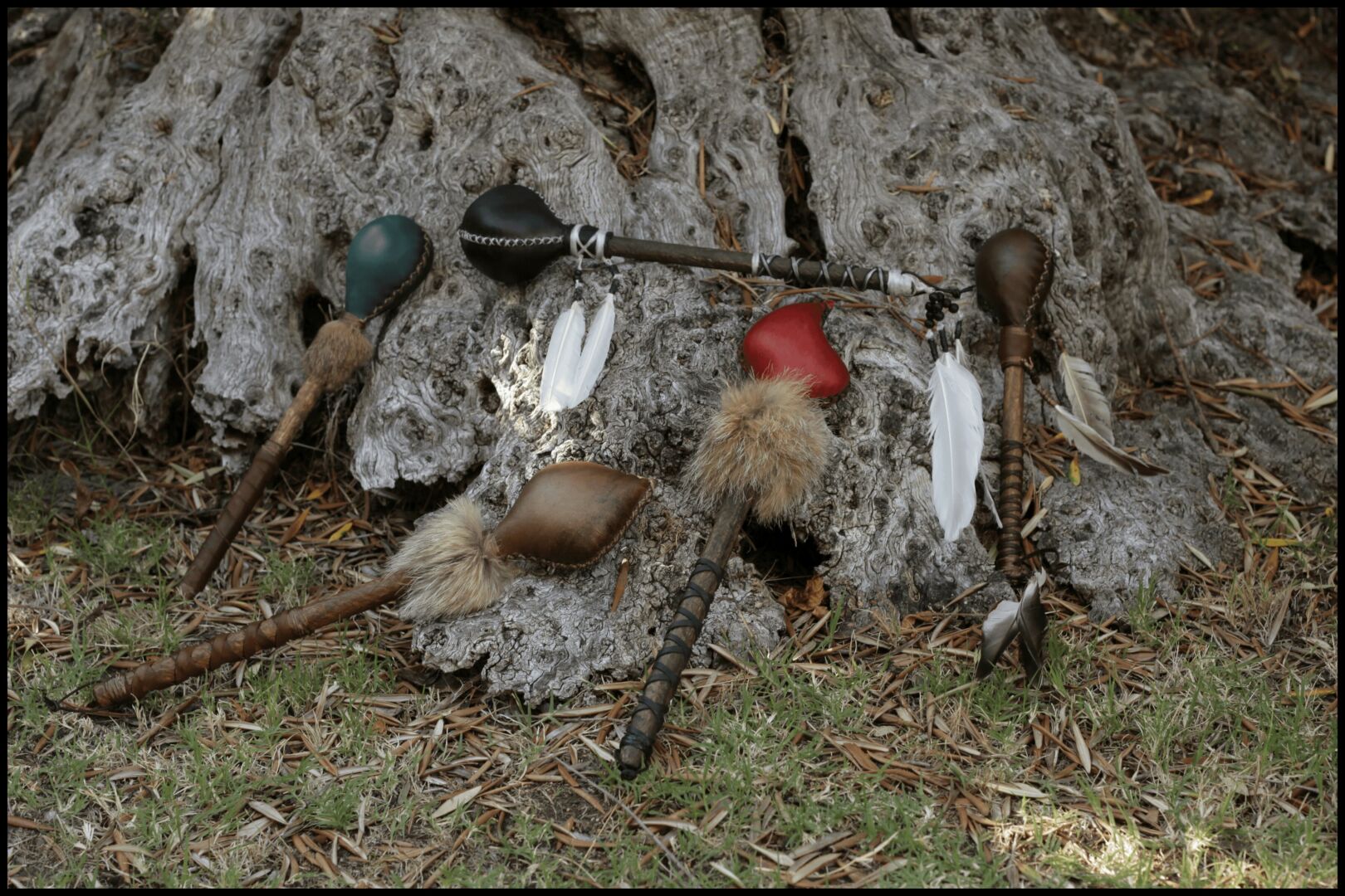 The rattles are also handcrafted, made of Deer or Elk hide and filled with different things to achieve their desired tones. Some are even trimmed with various furs to draw in the power of that specific animal.