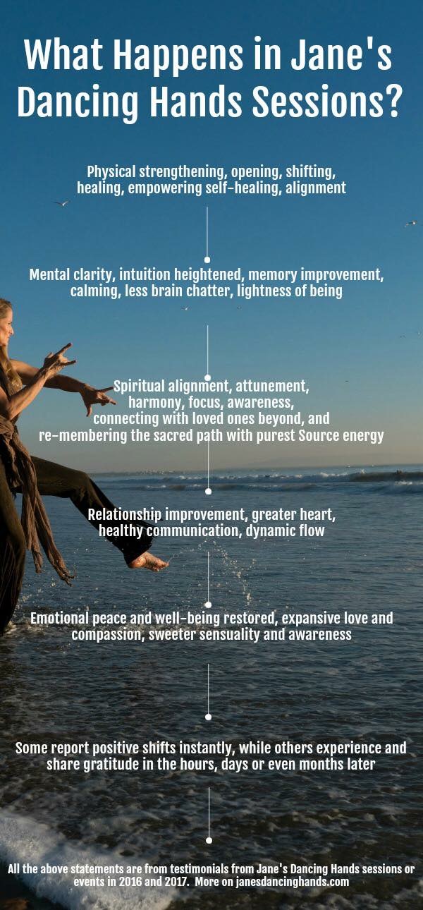 For ten years, this gift of the Dancing Hands (and now, all parts of my being) has helped others connect with their gifts and come to a place of tremendous healing. Tumors or pain have disappeared, addictions have dissolved, careers have flourished, broken bones have fused, and people have fallen in love with others or their lives. There are myriad testimonials of how this gift has helped people of all faiths (believers and non-believers), animals, or even situations. Using all the tools in my purposeful, often funny toolbox taught as a young actress, every person and every piece is essential to the puzzle. Every situation is a metaphor. We all can access our stories and revise for the highest and best good for one and all, as we go.