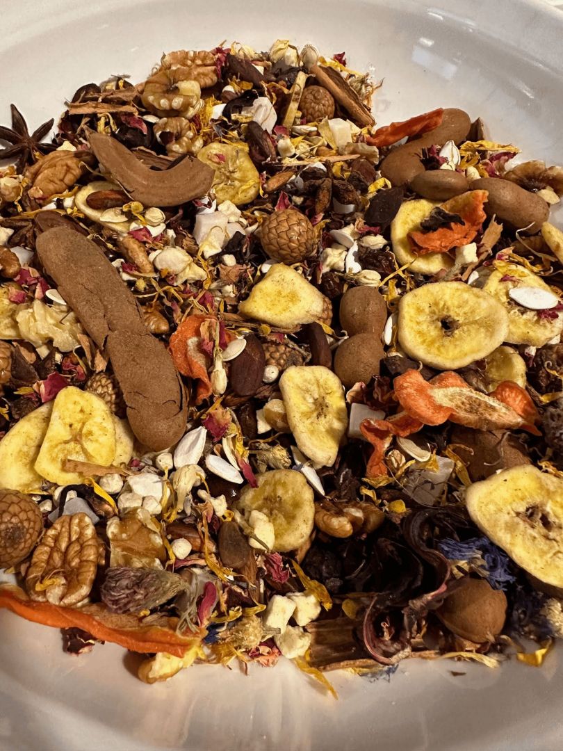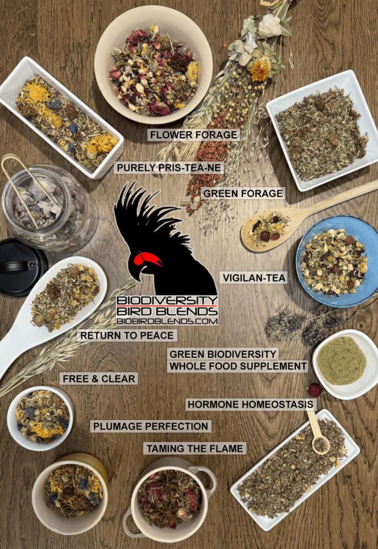 Biodiversity Bird Blends takes what we know about the foraging habits of the many avian species we manage and helps our clients provide biologically appropriate options that not only enrich the body, but also the mind. To truly provide an enriching environment for our pets, we need to take into consideration their natural history, or how they have evolved to live in their wild habitats. And since birds like most parrots spend much of their day foraging, it’s important we provide an environment that allows for these naturalistic behaviors. This means providing a variety of food items that allow birds to experience different tastes, textures, smells and more. This also includes the line of avian teas I have formulated as most birds drink from sources that have plant components leaching compounds like tannins into the water. We can take advantage of this by blending the many different beneficial herbs, flowers, teas, etc. that science has shown us have benefits. There are teas that have been shown to reduce anxiety, support detoxification, reduce inflammation, and more. Adding teas to the drinking water can help support any bird’s health and even offer additional nutrients. It is important to get teas for your animals that has been formulated by someone who knows what they’re doing; too many think they can just throw some things together without any negative effects. I am happy that I can use my background in science to understand the many different items I am blending so they can benefit the birds we keep.