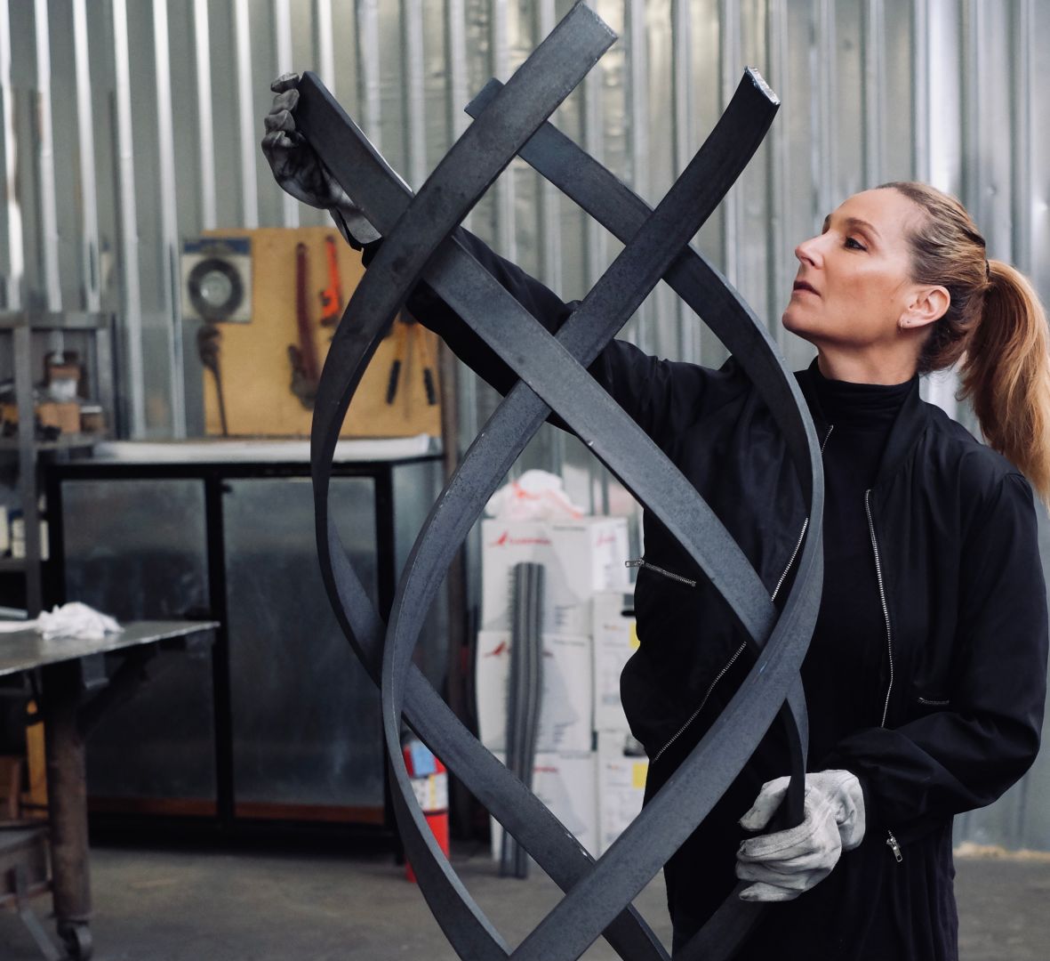 I wouldn’t have a sculpture practice without the amazing support of my business partner and our studio team – a multi-generational family of metal fabricators with whom I collaborate to shear, bend, weld, polish and paint my sculpture. I was lucky enough to connect with these talented people in south Los Angeles. It’s a dream team that makes my vision come to life every day.