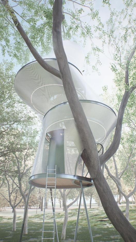 The most distinctive feature of the treehouse titled ““Between Syclla and Charybdis” is its use of a living tree as the core element of the structure. The entire building is designed around the tree, with the trunk passing through the main body, forming a natural “axis of life.” This design not only preserves the original natural landscape but also closely integrates the building with its environment. The treehouse employs large-scale membrane structures and an open design to achieve ample natural lighting and ventilation. The leaves, changing with the seasons, provide shade or allow light to filter through, enabling residents to feel the rhythm of nature in every season.