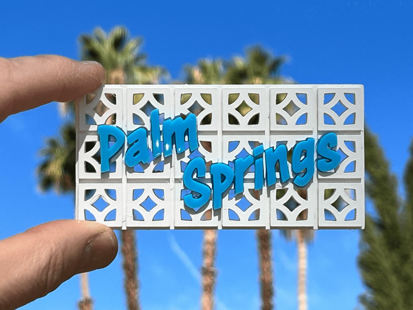 I’ve always been slightly entrepreneurially-minded. When I was about 6 I set up a desk in our family living room trying to sell seashells I’d found at the beach that day. Fortunately that didn’t take off. After several decades of working with materials and creative processes my husband and I landed in Palm Springs. Within a few months I learned about these fantastic things called breeze blocks, the concrete building blocks used in widely in midcentury architecture. I bought my first breeze block and made it into a table lamp. I was so enamored with the varied geometry and patterns they created I was compelled to find other ways to express myself with them. A friend said “how about making a keychain”? and that got the ball really rolling. Next came coasters, then magnets, more lamps, ice cube trays, and more recently, nightlights and bottle toppers. I’d been working at our local Ace Hardware store and they were generous (or crazy) enough to test out some of my products and they did well enough to forge ahead. While each piece is hand made, my designs walk the line between merch and art which I like. My breeze block designs are now in 4 of my favorite retail spots here in town, a far cry from that desk of seashells in my childhood living room.