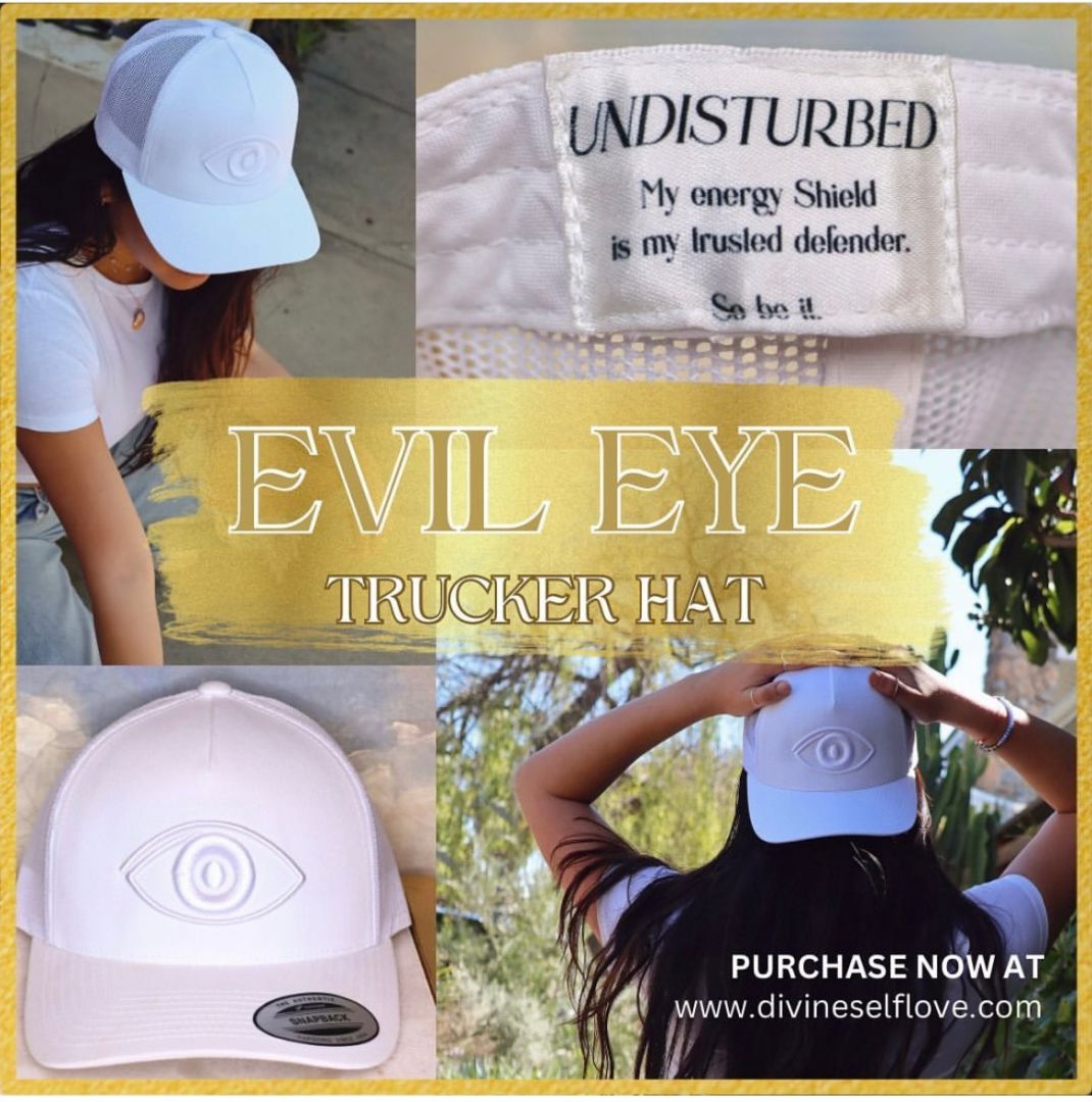 “My energy shield is a gift from above.” and “My energy shield is my trusted defender”, are other powerful affirmations embedded in my evil eye trucker hats. The affirmations provide confidence and assurance that we are always protected by the universe. These magical evil eye hats fend off haters and protect against malice and misfortune. The evil eye symbol is a supernatural belief inspired by envy. The symbol is believed to provide protection against malevolent glares that intend for something bad to happen to the recipient.