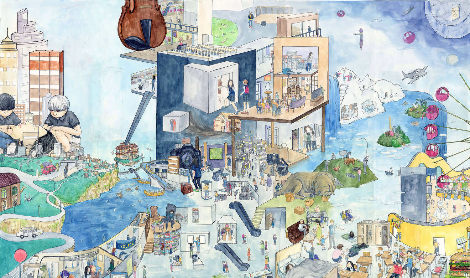 ‘ZZZ’ series consist of watercolor drawings based on dream journal, and a 24minutes long experimental animations completed in 2018. My pieces explores the borderlands of consciousness and home through dream. Using a mix of traditional and digital mediums to create imaginary worlds, I combined personal experiences and social issues such as racism, misogyny, homophobia, familism, and social pressures in East Asian culture. In my work students in school uniforms float above the sea with chairs and desks while taking an exam. Some of them try to escape and swim to land. I ask the audience to take a closer look at these details and create their own responses based on their individual interpretations of these unusual scenes composed with the tangled dream fragments. The harmony and distortion between the traditional and digital mediums also question the boundaries of different dimensions and concepts to express ideas of unconsciousness and home. I was able to do my first solo exhibition featuring this series as a part of my BFA thesis.