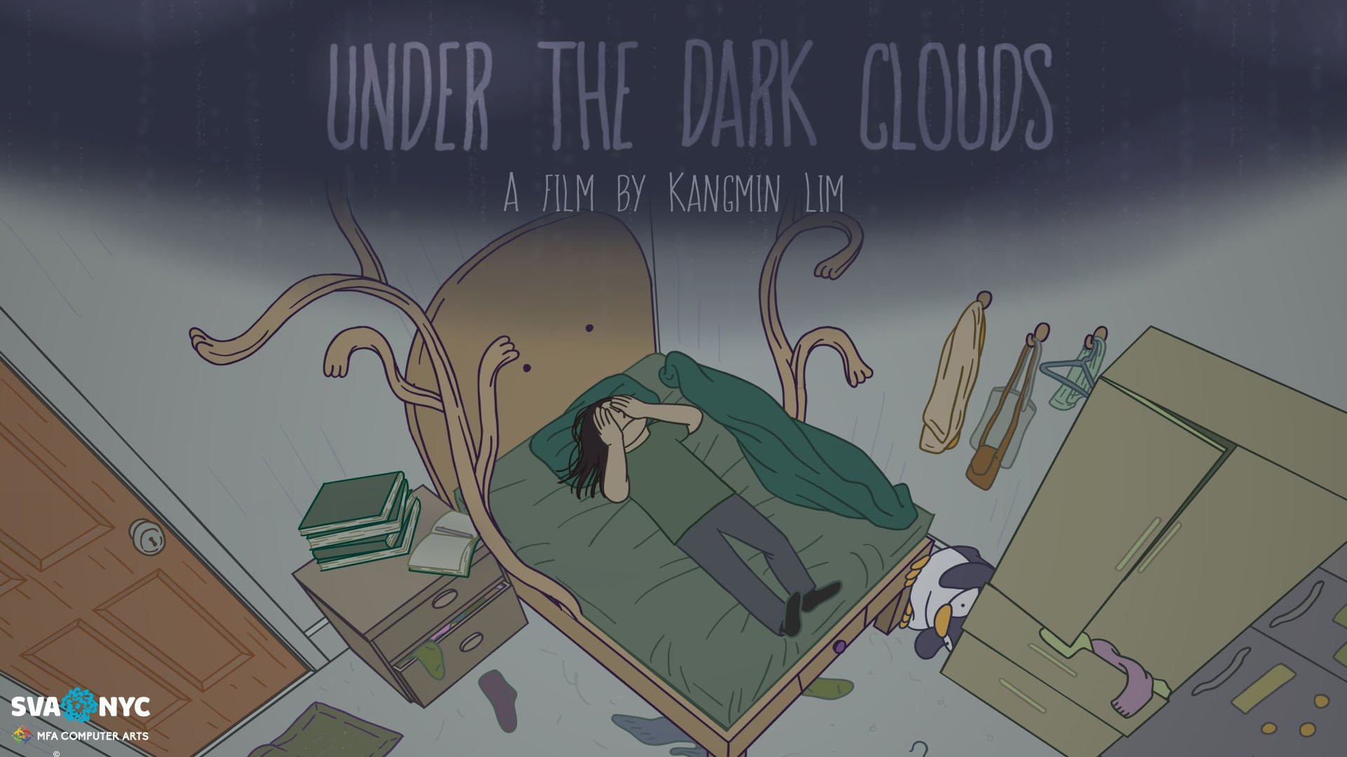 After making a series of weird experimental animations, I wanted to learn digital animation and film-making professionally. Luckily, I got into a graduate school where I learned about computer arts more in depth and created many short clips and and character-based narrative film. Under the Dark Clouds is a 2D mixed-media fantasy animation about visiting a dream world. It uses digitally hand-drawn character animation with watercolor stop-motion and crayon drawings as a background. The Main character, Stra, tends to sleep when she wants to escape from reality. One of the main characters, Beddy, lets Stra enter a dream world, where Stra faces herself and accepts her depression. This film addresses the idea of self-acceptance, and how dreams reflect our unconsciousness. UDFC won some awards including Student Design category from Los Angeles Animation Festival and has selected to more than 30 film festivals all around the world including; Warsaw Animation Film Festival(Poland), 8th Canlandıranlar(Turkey), Palm Springs Int. Animation Festival(CA), and Siggraph MetroCAF(NY).