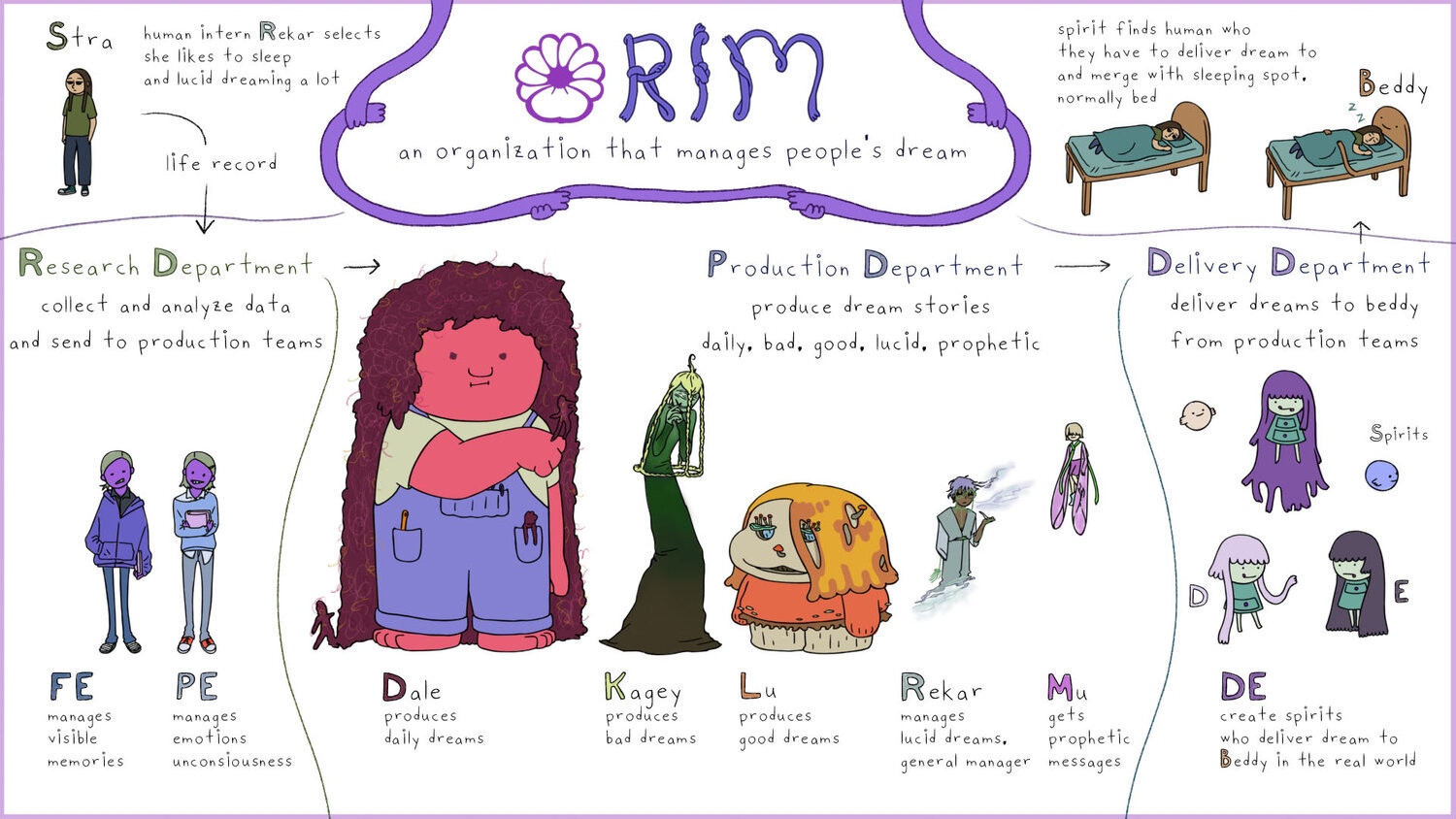After making a series of weird experimental animations, I wanted to learn digital animation and film-making professionally. Luckily, I got into a graduate school where I learned about computer arts more in depth and created many short clips and and character-based narrative film. Under the Dark Clouds is a 2D mixed-media fantasy animation about visiting a dream world. It uses digitally hand-drawn character animation with watercolor stop-motion and crayon drawings as a background. The Main character, Stra, tends to sleep when she wants to escape from reality. One of the main characters, Beddy, lets Stra enter a dream world, where Stra faces herself and accepts her depression. This film addresses the idea of self-acceptance, and how dreams reflect our unconsciousness. UDFC won some awards including Student Design category from Los Angeles Animation Festival and has selected to more than 30 film festivals all around the world including; Warsaw Animation Film Festival(Poland), 8th Canlandıranlar(Turkey), Palm Springs Int. Animation Festival(CA), and Siggraph MetroCAF(NY).