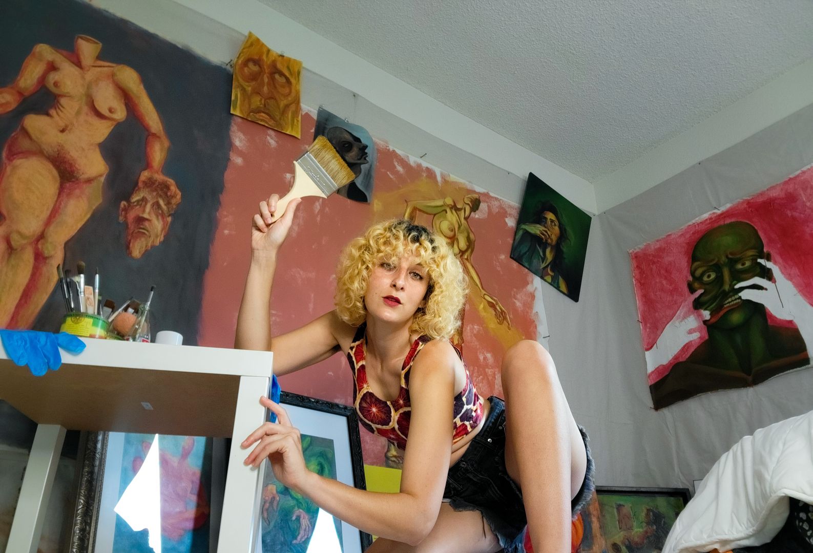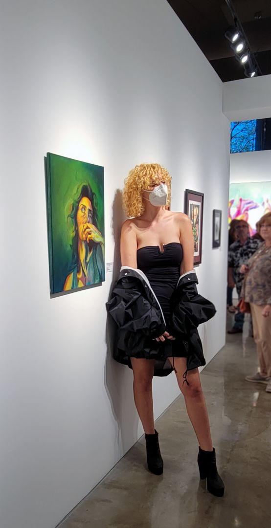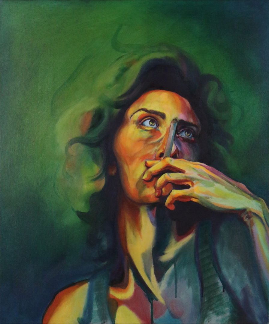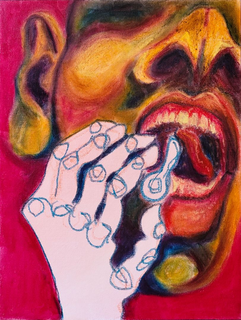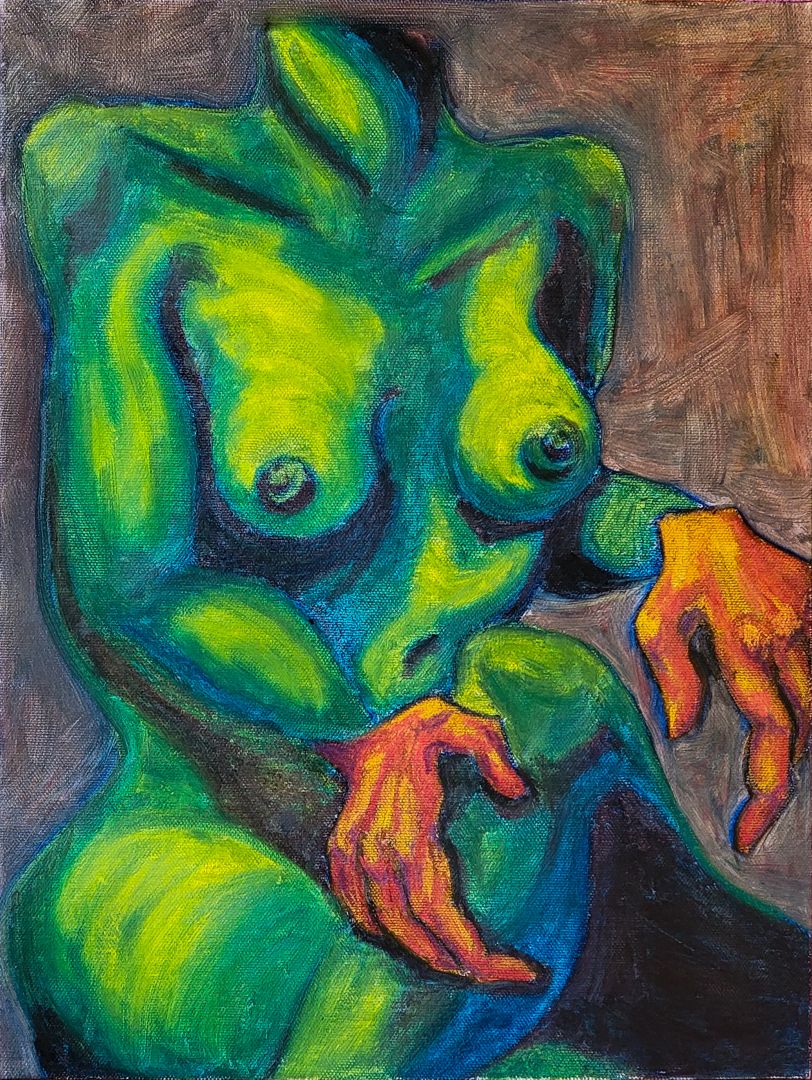 So you’ll notice in my paintings that the figures will have abstracted or differently rendered hands, or will be missing faces or even heads entirely, so that that tension between the body and the self is really forefront. And I really want you, as the viewer, to see yourself in the body, to feel your “self” being observed. We sort of take for granted that what we see in the mirror or in photos or videos is accurate, but it’s not really the same thing at all. You never really get to experience your face from the outside, to see it while others are seeing it, because you’re always behind it, looking outward. It’s a hole in your perception of yourself. I want you to gaze at your own navel, I guess.