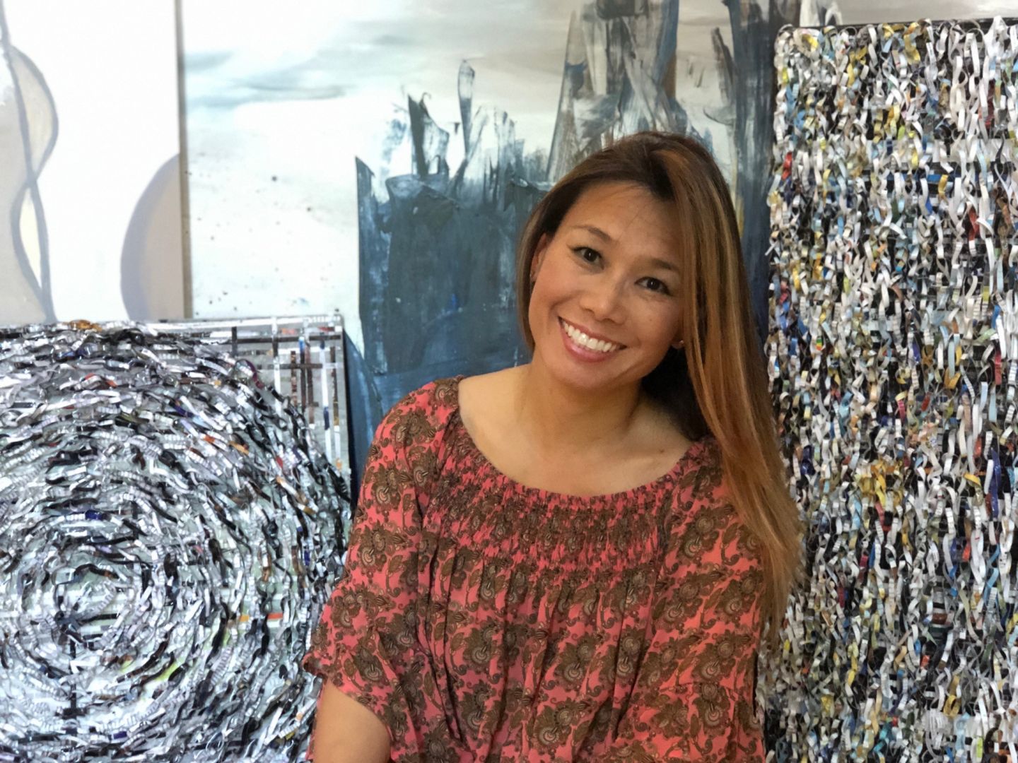 I also have a background in Chemical Engineering where I’ve worked on environmental cleanup projects for Superfund sites and also worked for Boeing as a subcontractor to NASA for the International Space Station program. I feel fortunate to be able to draw from my experiences to create art. I created “Global Harmony” to reflect my voice on the subject of world peace and environmental awareness. It won an award at a juried exhibit. It’s made from hand woven strips of upcycled maps and pages from National Geographics united into a unique, balanced mixed-media painting…showing how the colors and textures work together in harmony.