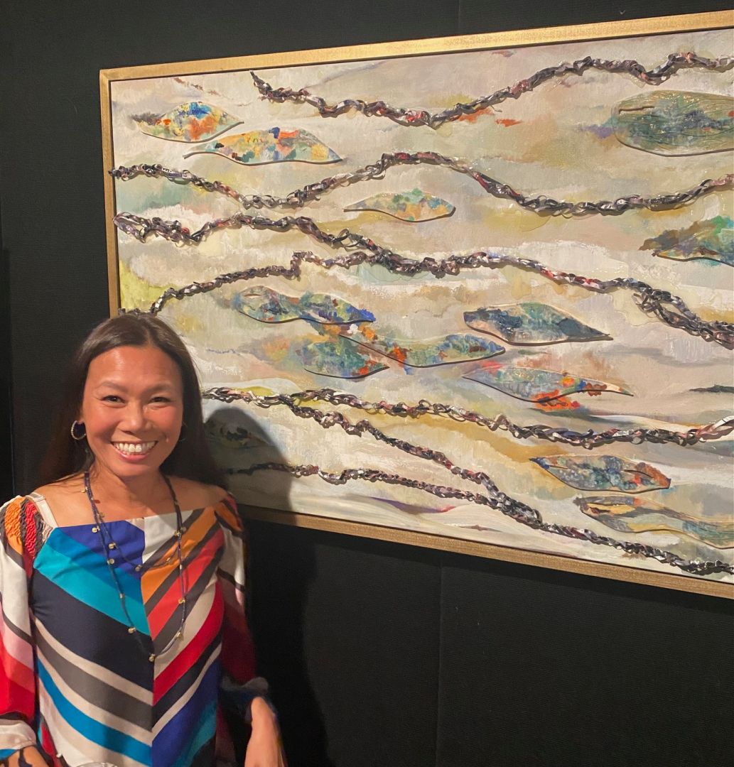 My oil painting “Mother’s Journey” was an expressionistic piece created when I realized my mother was developing age-related issues, reflecting on my own experiences as a mother and daughter, and further inspired by her favorite song by Misora Hibari. The song is about the flow of a river and how it parallels the twists and turns we embrace and endure in our lives. For me, the painting represented motherhood…the joys, obstacles, victories, love and loss.