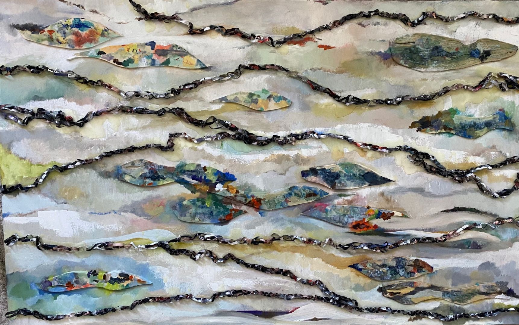 I also have a background in Chemical Engineering where I’ve worked on environmental cleanup projects for Superfund sites and also worked for Boeing as a subcontractor to NASA for the International Space Station program. I feel fortunate to be able to draw from my experiences to create art. I created “Global Harmony” to reflect my voice on the subject of world peace and environmental awareness. It won an award at a juried exhibit. It’s made from hand woven strips of upcycled maps and pages from National Geographics united into a unique, balanced mixed-media painting…showing how the colors and textures work together in harmony.
